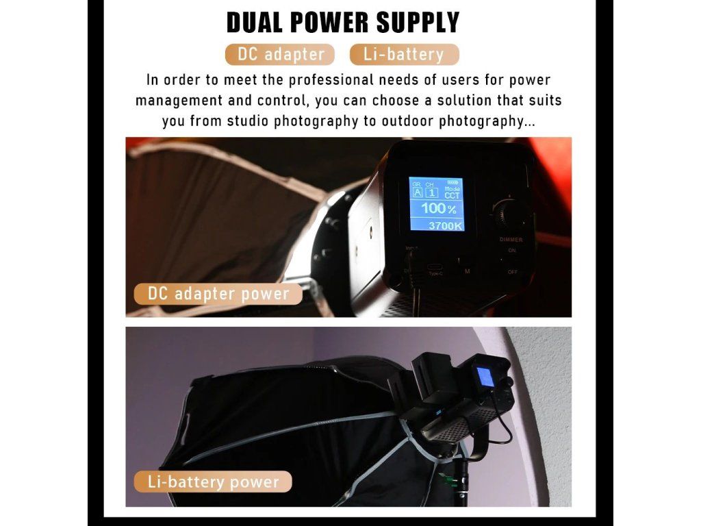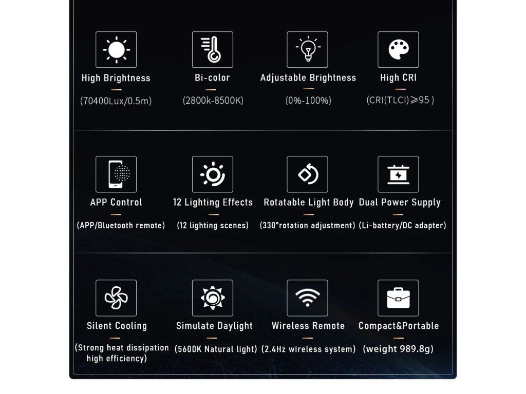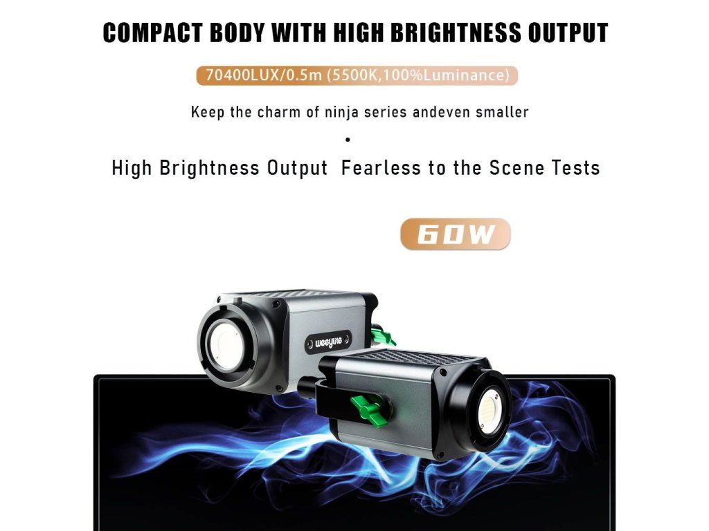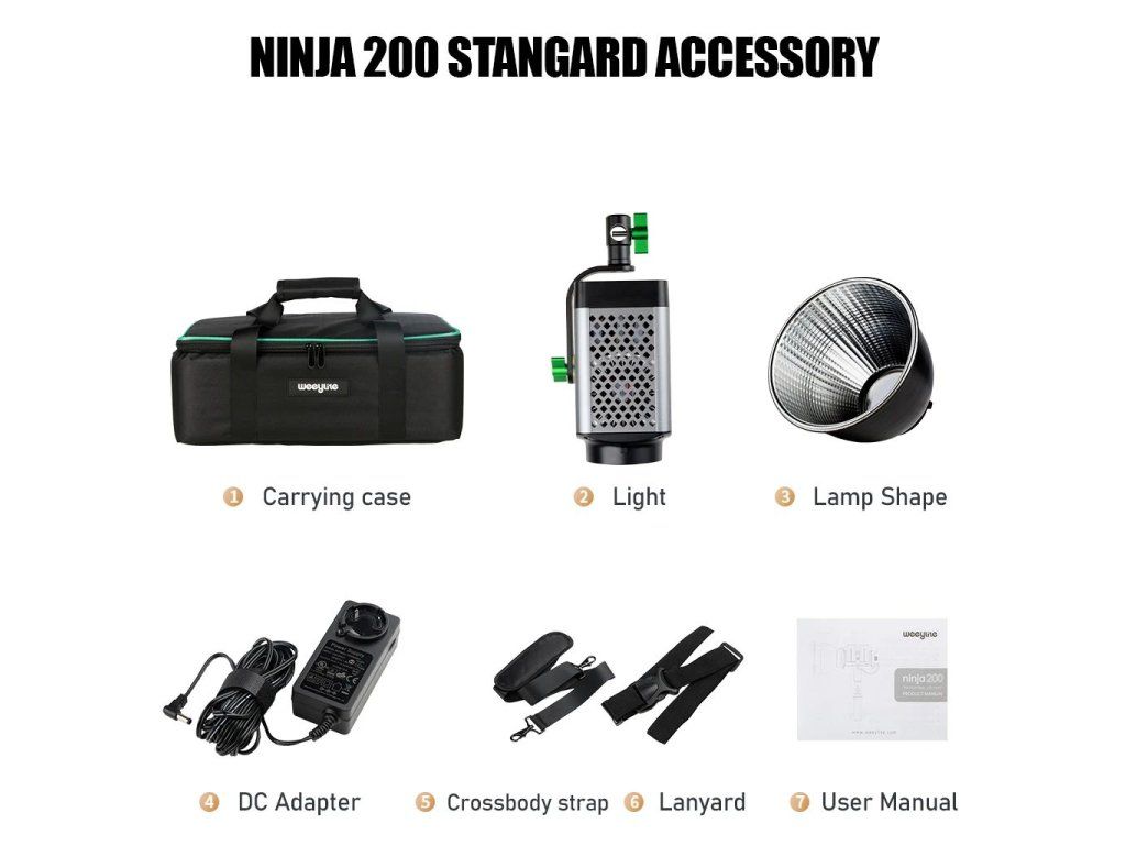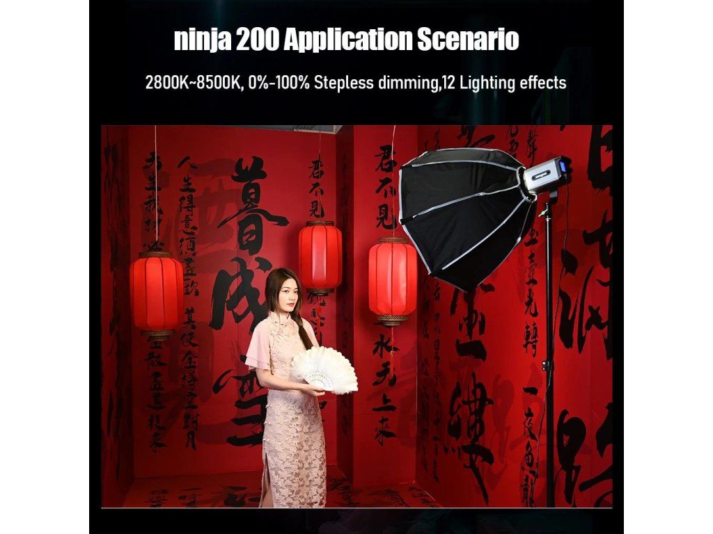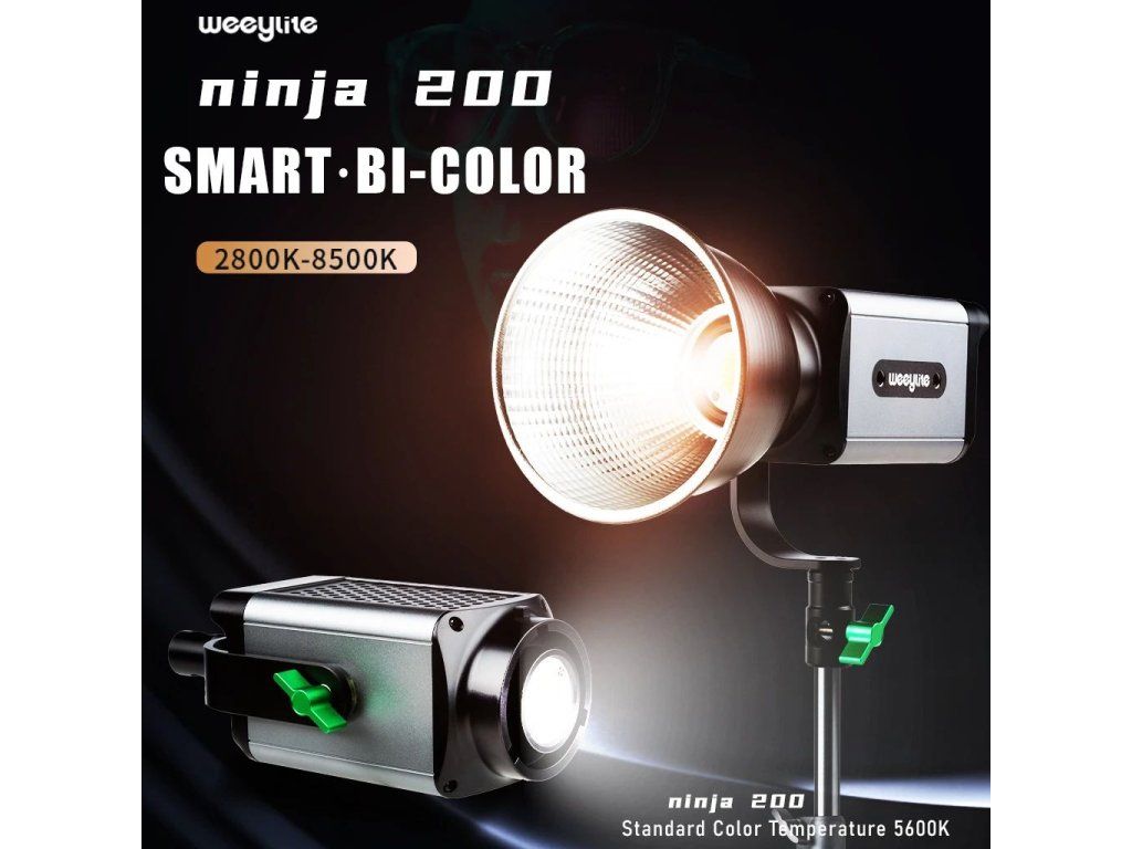 Studiový 60W Bi-color LED reflektor Weeylite Ninja 200 využívá moderní COB LED technologii pro vysoký světelný výkon a dobré podání barev (≥95 RA). Ideální pro studiovou fotografii, video apod. Nabízí plně nastavitelnou barevnou teplotu v rozsahu 2800K-8500K a intenzitu v rozsahu 0-100% (max. 5800 lm, 70400 lx/0,5 m). Dálkové ovládání je u tohoto modelu možné pomocí rozhraní Bluetooth a mobilní aplikace, napájení zajistí NP-960/970 baterie (není součástí balení) nebo externí PSU (zdroj je v balení obsažen). Rozměry 175x92x85 mm, váha 990 g. Méně výkonná, ale snáze přenosná varianta oblíbeného modelu Ninja 400.