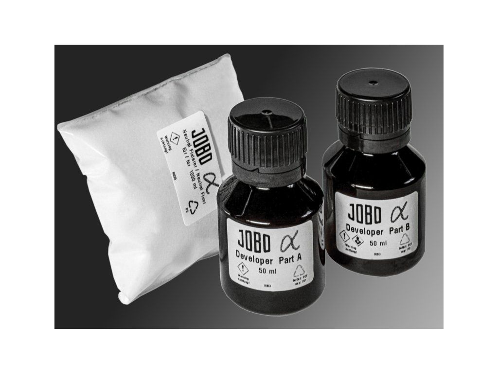 Není pochyb o tom, že vyvolání filmu je zásadním krokem. Každý film lze vyvolat pouze jednou. Čím lépe je vyvolání provedeno, tím stabilnější je základ, na kterém lze s filmem vytvořit vynikající kopie. Společnost JOBO vyvinula SW vývojku ve spolupráci s chemikem Klausem Wehnerem. Laboratorní testy ukázaly, že vývojka JOBO alfa umožňuje plně využít rychlost filmu a přitom se stále vyznačuje vysokou úrovní jemného zrna a ostrosti.Černobílá vývojka a ustalovač1 litr pracovního roztoku (8 filmů)optimální pro otáčenípro nejvyšší nárokyDoplňkové parametry