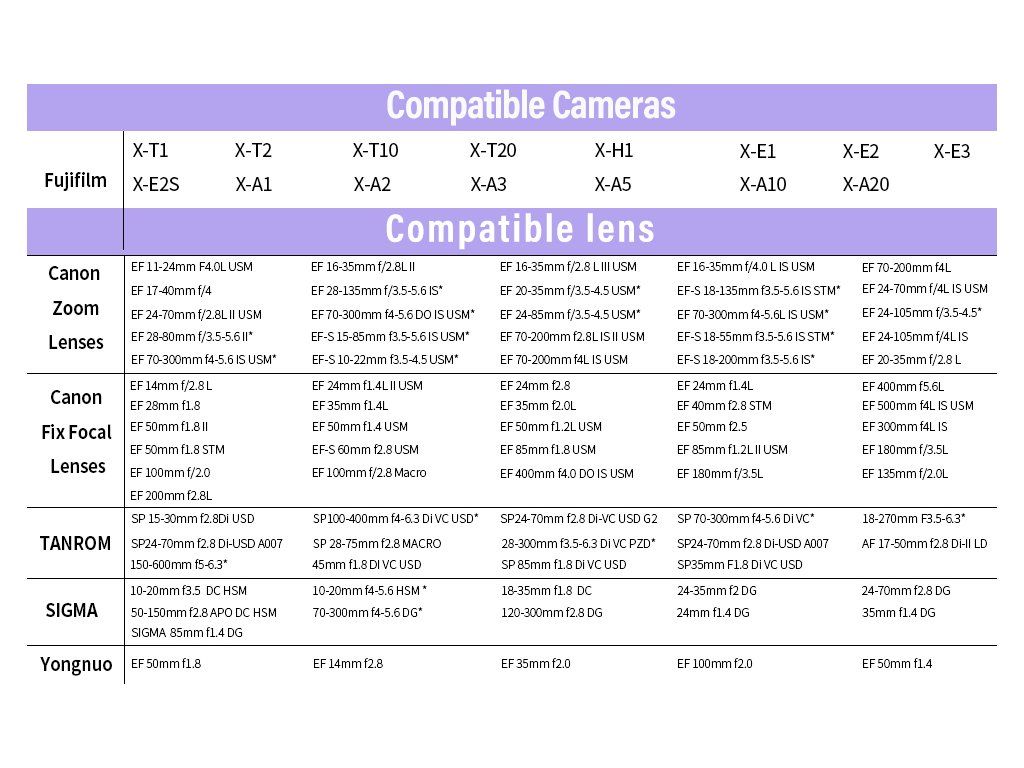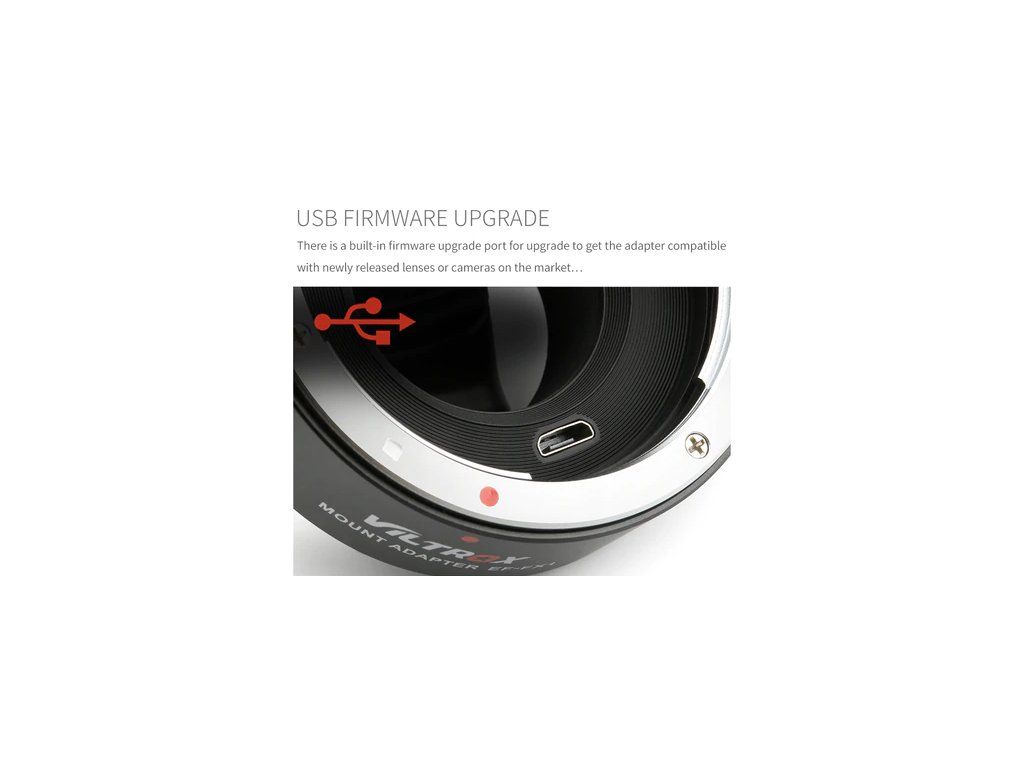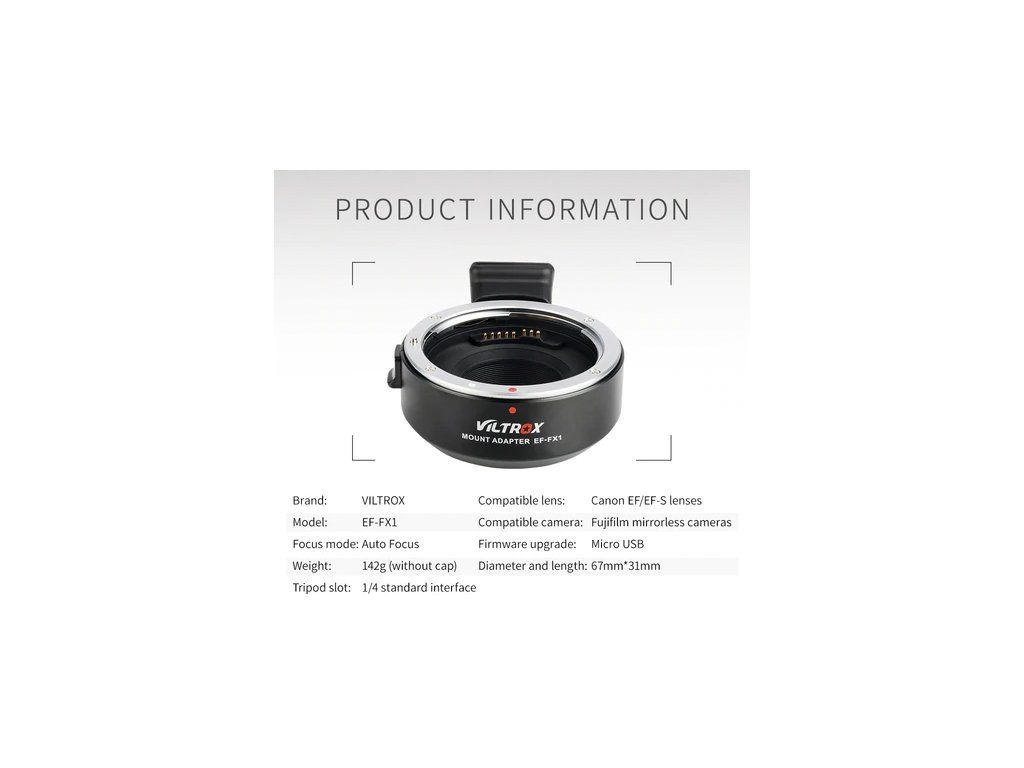 Adaptér Viltrox EF-FX1 je určen pro objektivy Canon řady EF/EF-S, které lze dokonale nasadit na bezzrcadlovky Fuji X-mount.Je vyroben z kovu s povrchovou úpravou, je odolný a pevný. Je vybaven elektronickými kontakty, podporuje automatické zaostřování, nastavení clony a přenos signálu EXIF. Firmware lze aktualizovat pomocí portu USB.