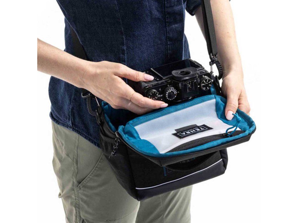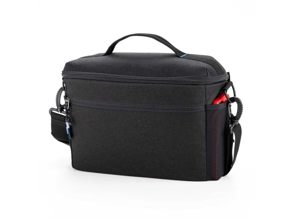 Víko brašny je navrženo tak, aby se otvíralo směrem od těla, což umožňuje rychlý přístup k vybavení. Boční kapsy ze strečové síťoviny jsou ideální pro láhev s vodou nebo další výbavu, jako jsou krytky objektivů. Vnitřní kapsa na zip je perfektní pro drobné příslušenství a cennosti, jako jsou paměťové karty, náhradní baterie, mobilní telefon nebo klíče.