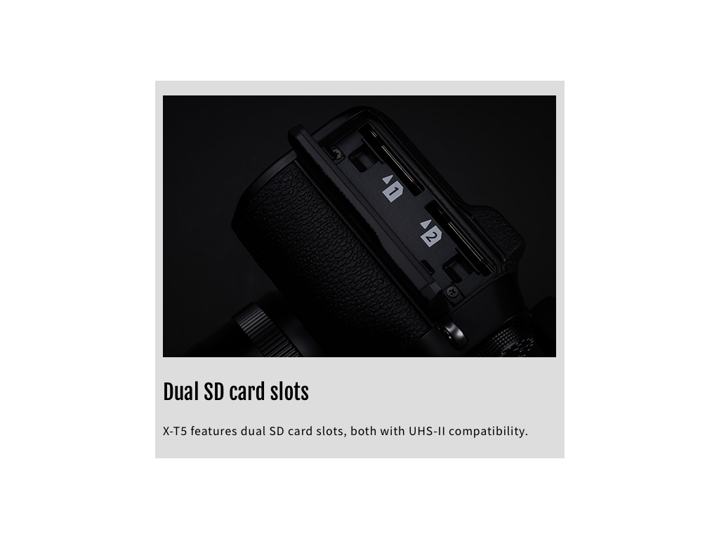 Na těle X-T5 je 56 bodů utěsněných pro vysokou úroveň odolnosti proti prachu a vlhkosti. Je konstruováno tak, aby vydrželo každodenní náročné profesionální používání a fungoval normálně při teplotách až – 10 °C.