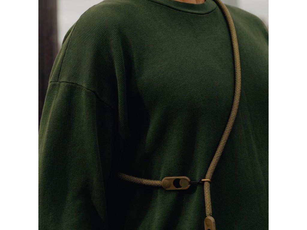 Materiál tvoří pletená směs nylonu a polyesteru se speciálně navrženým vnějším opletem, který klade důraz na rovnováhu mezi pevností, mírnou pružností a komfortem při nošení. Konektory kotviček jsou integrovány do konců popruhu tak, aby nepůsobily rušivě – bez výrazných boulí, švů či kroužků – čímž vzniká elegantní a minimalistický vzhled. Systém Anchor Link je upraven pro co nejnižší profil a přitom si zachovává nosnost až 90 kg.