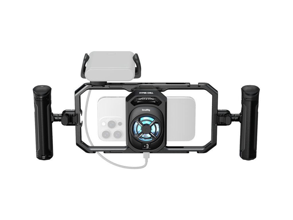 SmallRig 5276 All-in-One Thermal Dual-handheld Video Kit pro mobilní telefon Klec na telefon je vybavena výkonným 15W chladicím systémem se třemi úrovněmi chlazení, který účinně zabraňuje přehřátí zařízení a eliminuje problémy, jako jsou výpadky obrazovky a neočekávané vypínání při delším natáčení. Dvě otočné boční rukojeti zvyšují stabilitu a umožňují flexibilní nastavení úhlu pro pohodlné mobilní natáčení. Všestranný rozbočovač 4 v 1 USB-C kombinuje nabíjení, vstup pro mikrofon, monitorování zvuku a přenos videa 4K na externí disky SSD. Svorka navíc bezpečně drží vaše powerbanky a zajišťuje spolehlivé napájení pro nepřerušovaný provoz.  Kompatibilita:Kompatibilní se smartphony o šířce 64-79 mm. (Pro optimální výkon používejte bez pouzdra na telefon)Balení obsahuje:Univerzální chladicí klec na telefonRychloupínací otočná rukojeť s bezdrátovým ovládánímRychloupínací boční rukojeťRozbočovač USB-C 4 v 1Držák powerbankyUživatelská příručkaSystémové specifikace:Připojení: Port USB-CVstupní napětí: 5 VVstupní proud: 3A (max.)Pracovní výkon:3 úrovně:14W (vysoký)12.5W (střední)11W (nízký)Podpora nabíjení: QC / PD: 20W / 30W / 45W / 60W / 67W / 120WSpecifikace bezdrátového ovládání:Provozní výkon: 15mWPočáteční výkon: 0.006mWTyp baterie & Kapacita: CR2032 225mAhNapětí: 3VProud: 0.2AProvozní teplota: -30 ℃ až 60 ℃Rozsah bezdrátového ovládání: 10m Frekvence bezdrátového ovládání: 2,4G HzBezdrátové ovládání: 2,4G HzDoplňkové parametry