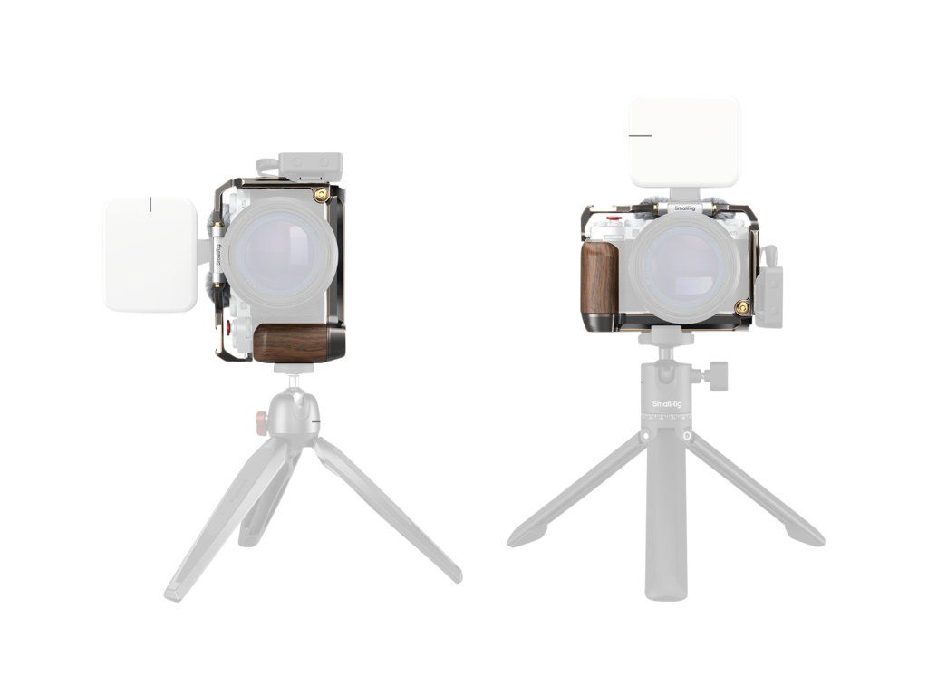 Vestavěná dřevěná rukojeť zlepšuje ergonomii a poskytuje pevný, přirozený úchop. Přístup ke všem důležitým prvkům – včetně baterie, tlačítek, slotů na karty i displeje – zůstává zcela volný. Klec nabízí bohatou škálu montážních možností: 1/4"-20 a 3/8"-16 závity (včetně ARRI stylu), cold shoe patku, otvory pro popruhy a další body pro upevnění příslušenství jako jsou mikrofony, světla nebo rukojeti.
