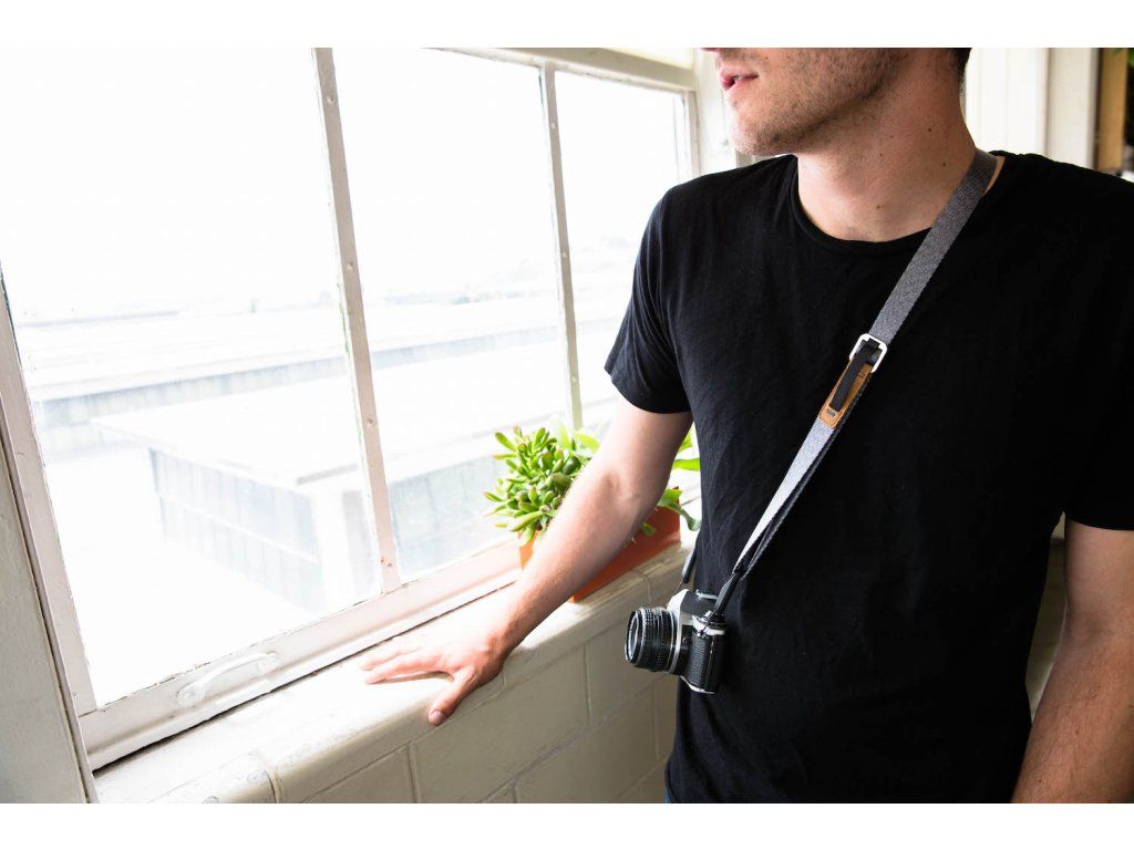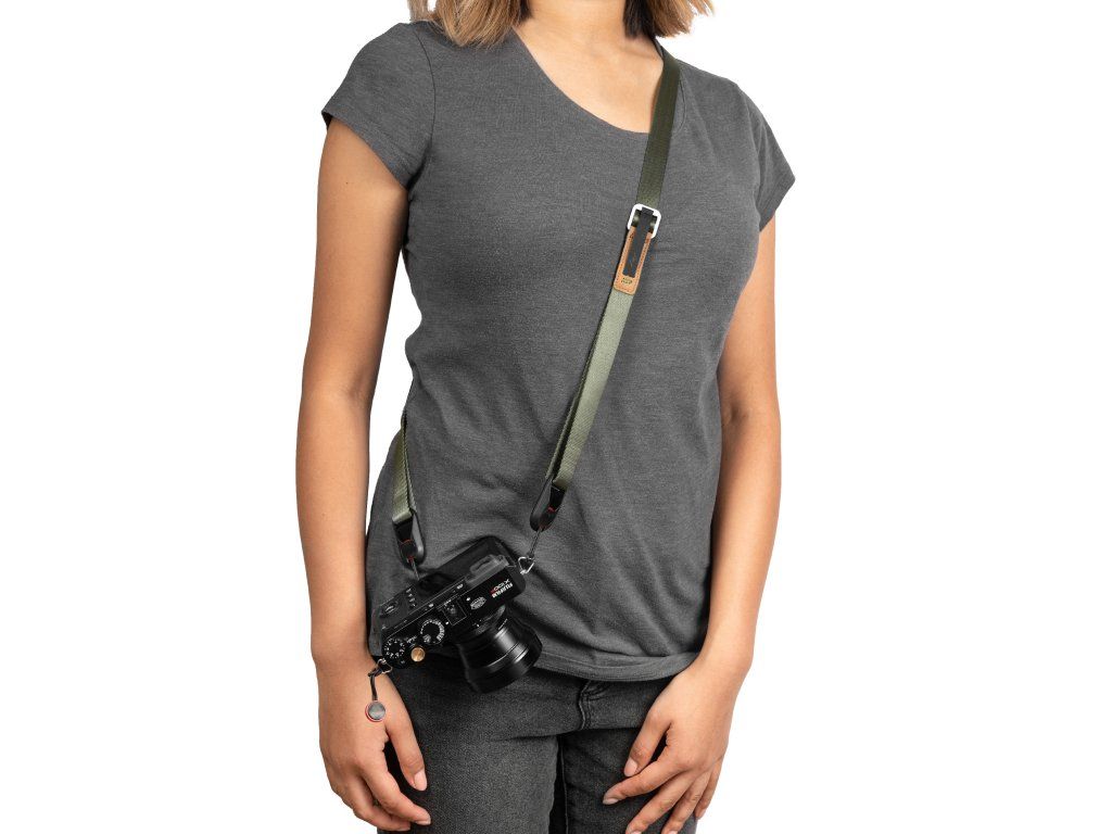- Klouže po oblečení Jemný úplet popruhu z materiálu podobného bezpečnostnímu pásu lehce klouže po oblečení a umožňuje rychlý přístup k fotoaparátu a celodenní komfort i s těžšími fotoaparáty.