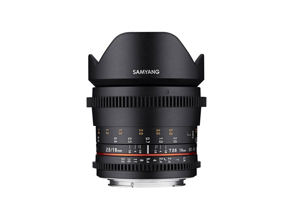 Samyang 16mm T2.6 VDSLR ED AS UMC je širokoúhlý video objektiv určený pro digitální zrcadlovky s full frame snímačem.16mm úhel záběru, který ztělesňuje renomovanou kvalitu obrazu širokoúhlých objektivů Samyang, je běžně používán kameramany po celém světě pro své všestranné využití a pro širokoúhlé emocionální scény ve filmu a videu.Konstrukce tohoto objektivu se skládá ze 14 členů v 11 skupinách a zahrnuje 2 skleněné asférické členy, 2 ED členy s extra nízkým rozptylem světla a 2 HR členy s vysokým indexem lomu. Ty se používají k zajištění účinného toku světla a minimalizaci barevných aberací a zkreslení.Samyang 16mm T2.6 je objektiv určený pro kinematografii a speciálně navržený pro profesionální follow focus systém díky tichým a plynulým (de-click) kroužkům (ostřící a clonový). Stupnice vzdálenosti a stupnice clonových čísel T jsou umístěny na obou stranách objektivu pro usnadnění natáčení.Tento objektiv je kompatibilní s 9 různými bajonety fotoaparátů: Canon EF, Nikon F, Pentax K, Sony A, Canon M, Fujifilm X, Samsung NX, Sony E a MFT.Hlavní vlastnosti:Světelnost T2.6Speciální optické členy - asférické, HR a EDPlynulý ostřící a clonový kroužekPovrchová úprava Ultra Multi Coating (UMC)9ti lamelová kruhová clonaVDSLR objektivTechnické parametry:Ohnisková vzdálenost: 16 mmSvětelnost: 2.6Konstrukce objektivu: 14 členů v 11 skupináchMinimální zaostřovací vzdálenost: 30 cmDélka: 93,6 - 122,4 mmHmotnost : 515 - 580 gPočet lamel clony: 9Maximální clonové číslo (T): 22Kompatibilní bajonety: Canon EF, Sony E, Pentax K, MFT, Nikon F, Fuji X, Canon M, Sony A, Olympus 4/3Vhodný pro žánr: architektura, interiéry, krajinaOhnisko: pevné Vhodný pro žánr: architektura, interiéry, krajina Ohnisko: pevnéDoplňkové parametry