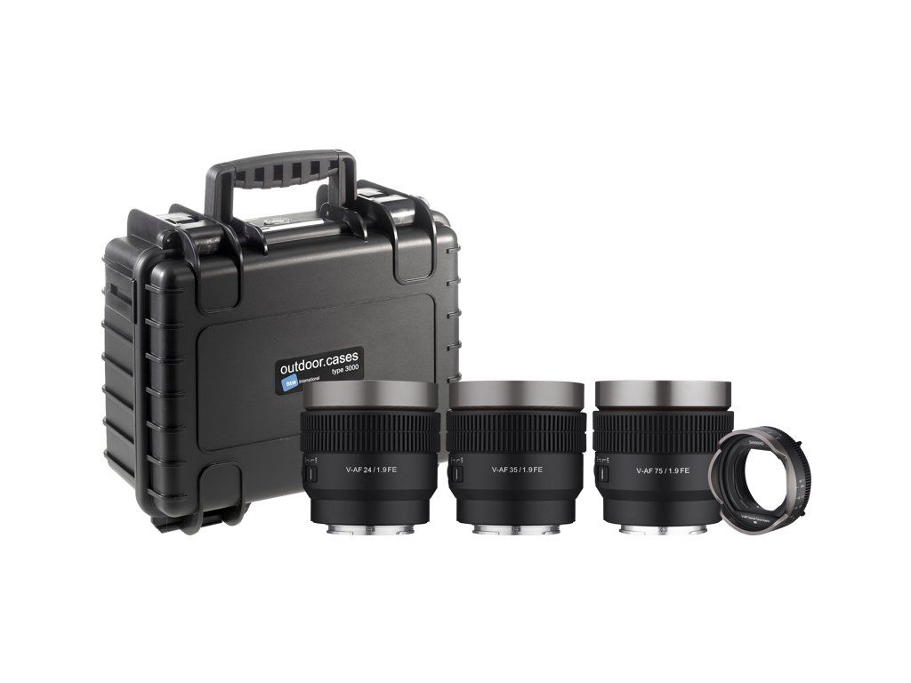 Sada objektivů V-AF od společnosti Samyang s MF adaptérem a pevným pouzdrem Díky jednotné hmotnosti a velikosti objektivů Samyang V-AF je snadné používat objektivy s příslušenstvím, jako jsou gimbaly nebo drony, protože nemusíte vyvažovat, což může být někdy časově náročné.Všechny objektivy mají dynamickou konstrukci, která vytváří úžasně ostrý filmový vzhled, a clona s 9 lamelami zajišťuje hladký a krémový bokeh, který snadno oddělí váš objekt od pozadí. Ruční adaptér V-AF Zaostřovací adaptér je vybaven dvojitou stupnicí s nožičkami i metry a jemné úpravy zaostření lze provádět plynulým otáčením o 300°. Zaostřovací kroužek má standardní mod 0,8 a lze jej kombinovat s libovolným následným zaostřováním.Adaptér se snadno připevní na přední stranu jakéhokoli objektivu V-AF s předním bajonetovým uchycením, což filmařům a kameramanům poskytuje úplnou kontrolu nad zaostřováním.Po nasazení adaptéru lze MF kroužek na straně objektivu použít jako clonový kroužek. Kontrolka na přední straně dává subjektu nebo fotografovi vědět, zda je fotoaparát v záznamovém nebo pohotovostním stavu, a přední průměr 95 mm umožňuje snadné připevnění matného boxu. Objektivy pro kinofilm jsou obvykle poměrně těžké a mají objemnou konstrukci. S novým adaptérem pro manuální ostření je možné mít všechny funkce běžného kinofilmového objektivu, ale v kompaktním formátu. V kombinaci s objektivem řady V-AF je celková hmotnost pouhých 430 g ve srovnání s kinofilmovým objektivem, který obvykle váží dvakrát tolik. Tvrdé pouzdro SamyangTvrdé pouzdro Samyang je navrženo společností B&W Outdoor Cases a je vyrobeno tak, aby umožňovalo organizaci, ochranu, přenášení a přežití v náročných podmínkách, tvrdé pouzdro je neproniknutelné a nezničitelné díky pevnému plášti a vynikajícímu systému západek. Díky exkluzivnímu systému zamykání a západek B&W zůstane kufr zavřený a zajištěný, dokud jej nebudete chtít otevřít. Sada obsahuje následující produkty: Samyang V-AF 75 mm T1,9 Sony FE Samyang V-AF 24 mm T1,9 Sony FE Samyang V-AF 35 mm T1,9 Sony FE Adaptér Samyang V-AF MF BW Outdoor Case Type 3000 s vlastní pěnou pro Samyang V-AF T1.9 Sony FEDoplňkové parametry
