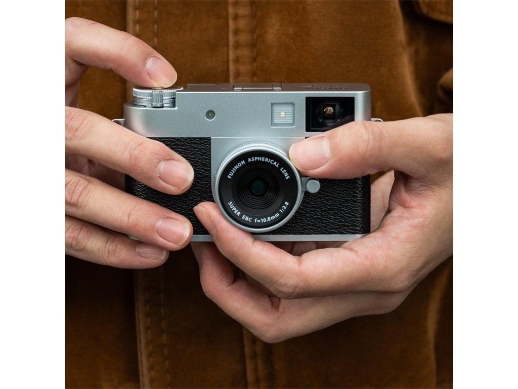 X-HF1 svým designem odkazuje na klasické analogové fotoaparáty a propojuje nadčasovou estetiku s moderní technologií. Na čelní straně se nachází malý, snadno přístupný vypínač. Po jeho aktivaci vyskočí páčka pro natažení závěrky – ano, skutečně připomíná mechaniku tradičního filmového fotoaparátu.