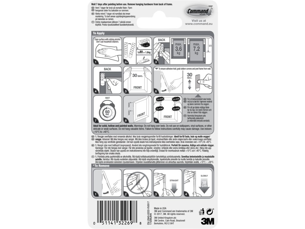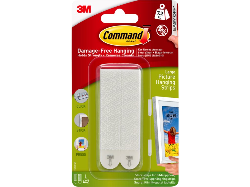 3M Command vám nabízí způsob, jak zorganizovat, ozdobit a změnit váš životní prostor bez poškození interiéru . Díky závěsným proužkům 3M Command Picture Hanging Strips na obrazy je aplikace rychlá a snadná nepotřebujete žádné nástroje ani vrtání.Jedna sada 4 proužků ve velikosti L udrží zátěž až 7,2 kg . Proužky 3M Command Picture Hanging Strips jsou vhodné nejen pro zavěšení obrazů, ale i dřevěných písmen, desek z akustické pěny, zrcadel, nástěnných hodin, tabulí pro suché mazání a mnoho dalšího. Rozměr jednoho proužku je 1,9 x 9,3 cm. Nejlepší je, že když bude třeba fotografie složit nebo přesunout, odstraníte je skutečně jednoduše a beze stop žádné otvory, díry, popraskaná omítka nebo zbytky lepidla.Díky tomu, že tyto proužky po sobě nezanechávají žádné stopy ani zbylé nečistoty , jsou ideální nejen pro výzdobu svého bytu nebo domu, ale i vysokoškolské koleje, školní třídy nebo kanceláře.Jedno kliknutí vám napoví, že závěsné proužky jsou dokonale uzamčeny a pevně drží. Silně drží na nejrůznějších interiérových površích včetně natřených stěn, lakovaného dřeva (např. dveře nebo skříně), natřeného betonového tvárnicového bloku, laminátu, skla, dlaždic, kovu a dalších hladkých povrchů.Závěsné proužky nejsou vhodné pro použití na tapetách, látkách, cihlovém povrchu, texturovaných stěnách a površích a na ostatních drsných a nepřilnavých površích. Hlavní vlastnosti: Nosnost: 7,2 kg na sadu Velikost L Rozměr proužku je 1,9 x 9,3 cm Maximální velikost rámečku 61 x 91 cm Barva bílá Obsah balení: 4 sady proužků Snadné použití a odstranění Pevně drží na různých površích Snadno se odstraňují bez zbylých nečistot Instrukce k vytvoření nástěnné koláže obrazů: 1) Na podlahu před prázdný prostor na stěně položte rámečky do vzoru, který chcete mít na zdi. 2) Vytvořte papírové šablony každého rámečku tak, že obrysy obkreslíte na papír a vystřihnete. Zavěste požadovaný vzor pomocí malířské pásky. Abyste si pamatovali rozvržení rámečků, napište na papírové šablony krátký popis každého obrázku. Ustupte a obdivujte svůj návrh koláže. 3) Jakmile budete spokojeni se svým rozložením, očistěte povrch stěny čistícím roztokem Isopropylalkohol podél okrajů každé papírové šablony, kam bude vaše rámečky patřit. Postupujte podle pokynů pro přípravu a očištění stěn podle pokynů na obalu závěsných proužků. Nepoužívejte žádné čisticí prostředky určené pro domácnost. 4) Na zadní stranu rámečku připevněte závěsné proužky 3M Command Picture Hanging Strips. Co se týče umísťování proužků a doporučené hmotnosti zátěže postupujte podle pokynů na obalu. Chcete-li vytvořit sadu, odtrhněte proužky a položte dva dohromady na sebe, dokud neuslyšíte kliknutí.Odstraňte jednu krycí fólii a lepící stranou položte proužek na rámeček. Proužek k rámečku pevně přitlačte, abyste zajistili pevné přilepení. Postup opakujte pro všechny proužky na rámečku. Poté odstraňte zbylé krycí fólie a na 30 sekund přitlačte rámeček na zeď. 5) Odstraňte rámeček ze zdi pomalým odlepováním ze spodní strany. Na každý proužek, který zůstal na zdi, tlačte po dobu 30 sekund, aby se pevně přichytil ke zdi. 6) Celý postup opakujte pro všechny rámečky podle předem naplánovaného rozložení. Pokud chcete mít jistotu, že budou rámečky přilepené rovně, můžete využít pomoci partnera, kamaráda, rodiče, prostě kohokoli, s kým si užijete hodně zábavy. 7) Počkejte jednu hodinu, než rámečky znovu připevníte, a to tak, že proužky přitlačíte k sobě, dokud nezaklapnou. Pokud není rámeček vyrovnaný, odlepte ho a připevněte znovu.Doplňkové parametry