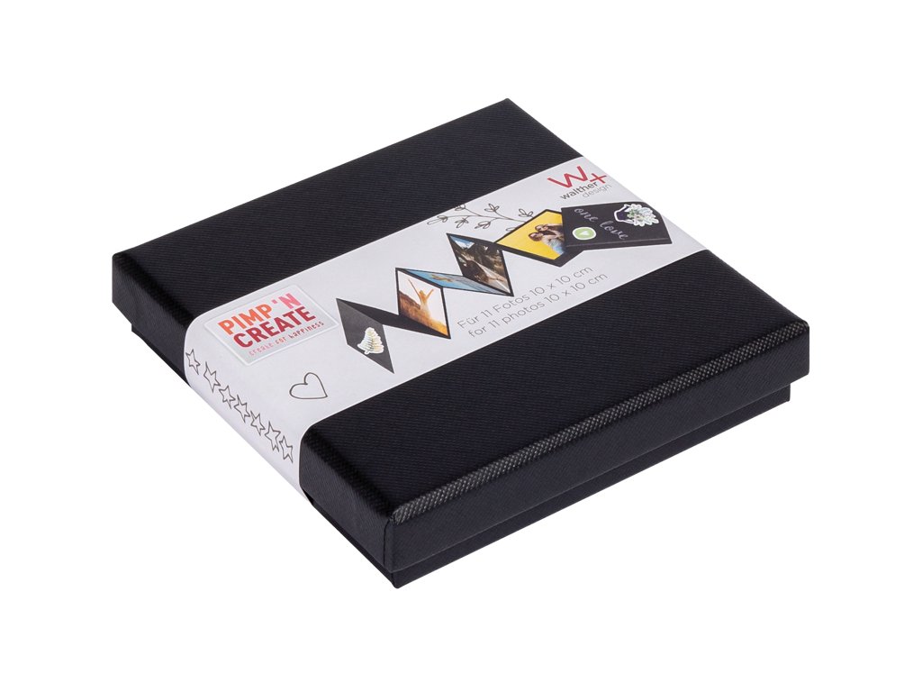 Krabička s leporelem na 11 fotografií ve formátu 10 × 10 cm. Krabička v klasickém designu je k dispozici v černé barvě s černým vnitřkem. Vyrobeno z vysoce kvalitního strukturovaného papíru.Barva: černá (strukturovaný papír)Doplňkové parametry
