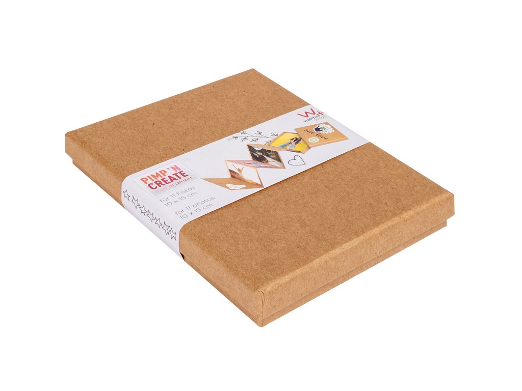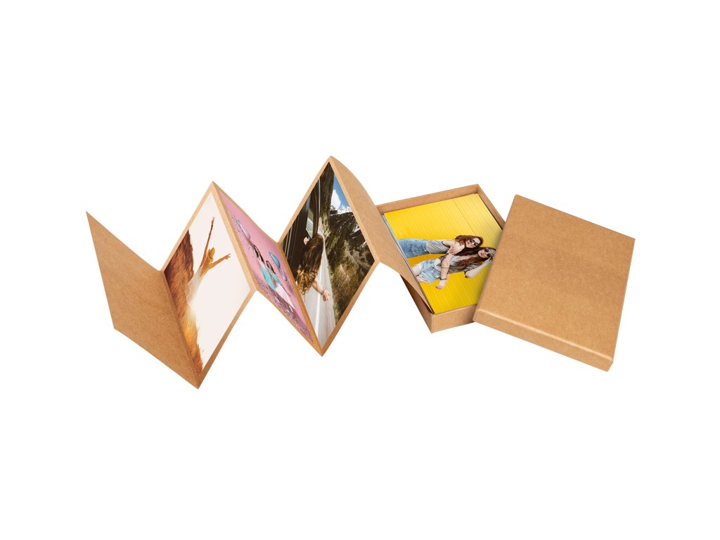 Krabička s leporelem na 11 fotografií ve formátu 10 × 15 cm. Krabička v okázalém designu je vyrobena z hnědého řemeslného papíru a má hnědý vnitřek.Vyrobeno z vysoce kvalitního strukturovaného papíru.Barva: hnědá (řemeslný papír)Doplňkové parametry