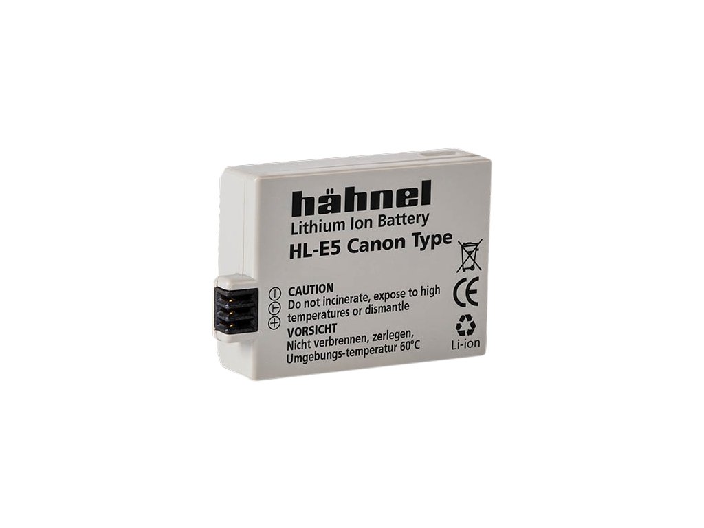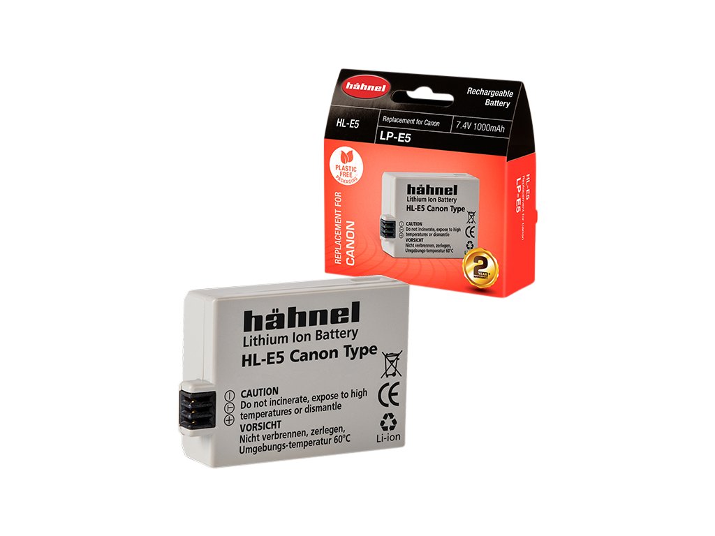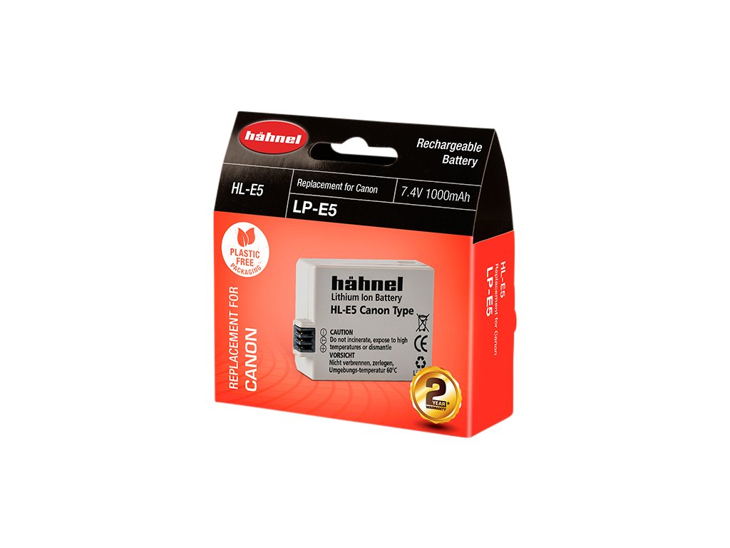 Baterie Hähnel Canon HL-E5 / LP-E5 Baterie je vyrobena z vysoce kvalitních článků a disponuje ochranným obvodem proti přetížení a zkratu.Součástí balení je také kryt baterie. Technické specifikace: Typ baterie: Li-Ion Napětí: 7.4V Kapacita: 1000mAh Kapacita (Wh): 7.4WhDoplňkové parametry