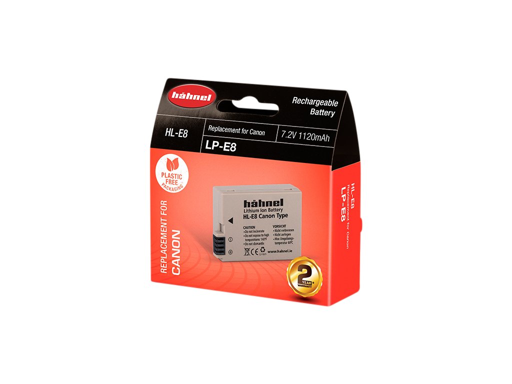 Baterie Hähnel Canon HL-E8 / LP-E8 Baterie je vyrobena z vysoce kvalitních článků a disponuje ochranným obvodem proti přetížení a zkratu.Součástí balení je také kryt baterie. Technické specifikace: Typ baterie: Li-Ion Napětí: 7.2V Kapacita: 1120mAh Kapacita (Wh): 8.1Wh