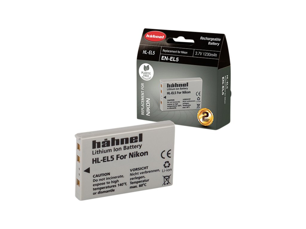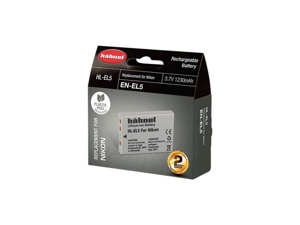Hähnel HL-EL5 je alternativní baterie k originální baterii Nikon EN-EL5. Baterie je vyrobena z vysoce kvalitních článků a disponuje ochranným obvodem proti přetížení a zkratu.Součástí balení je také kryt baterie. Technické specifikace: Typ baterie: Li-Ion Napětí: 3.7V Kapacita: 1230mAh Kapacita (Wh): 4.6WhDoplňkové parametry
