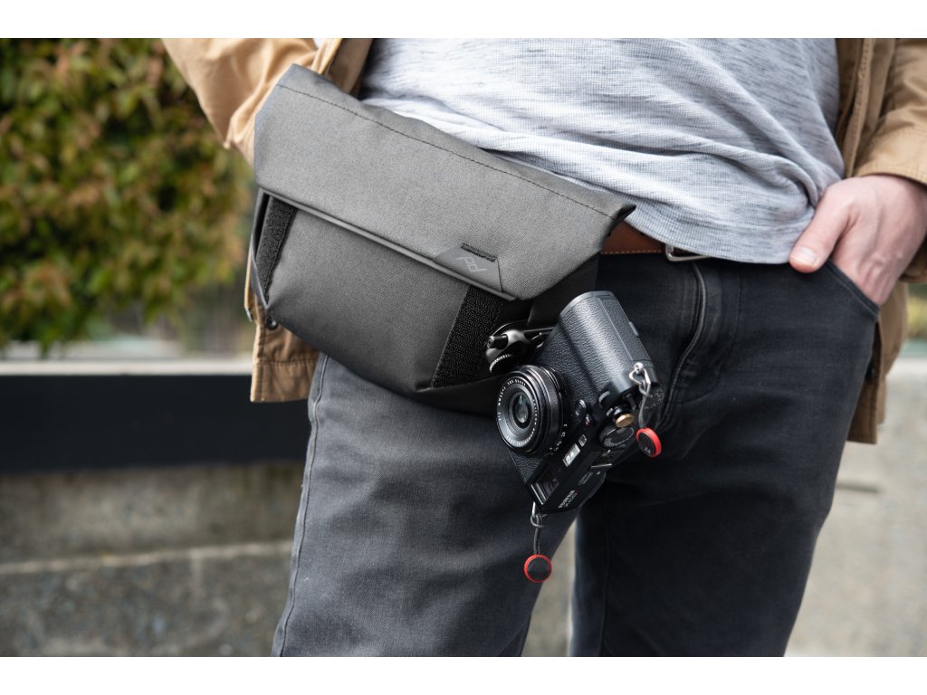 Přiložený ultralehký nastavitelný popruh umožňuje nošení přes nebo na rameni, poutka na opasek umožňují nošení v pase. S lehkou foto výbavou připojte držák Capture (prodává se samostatně) a noste fotoaparát vně pouzdra – fotoaparát je tak vždy po ruce a zvýšíte úložný prostor pro příslušenství.