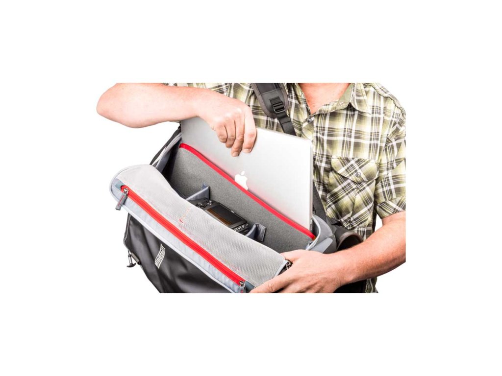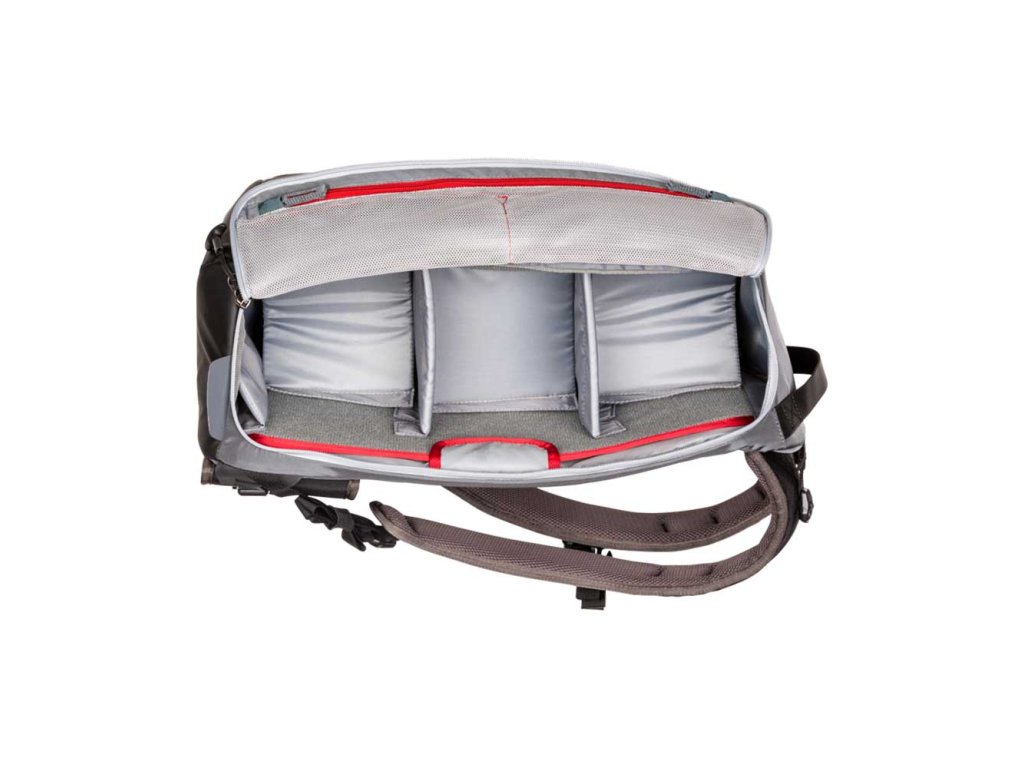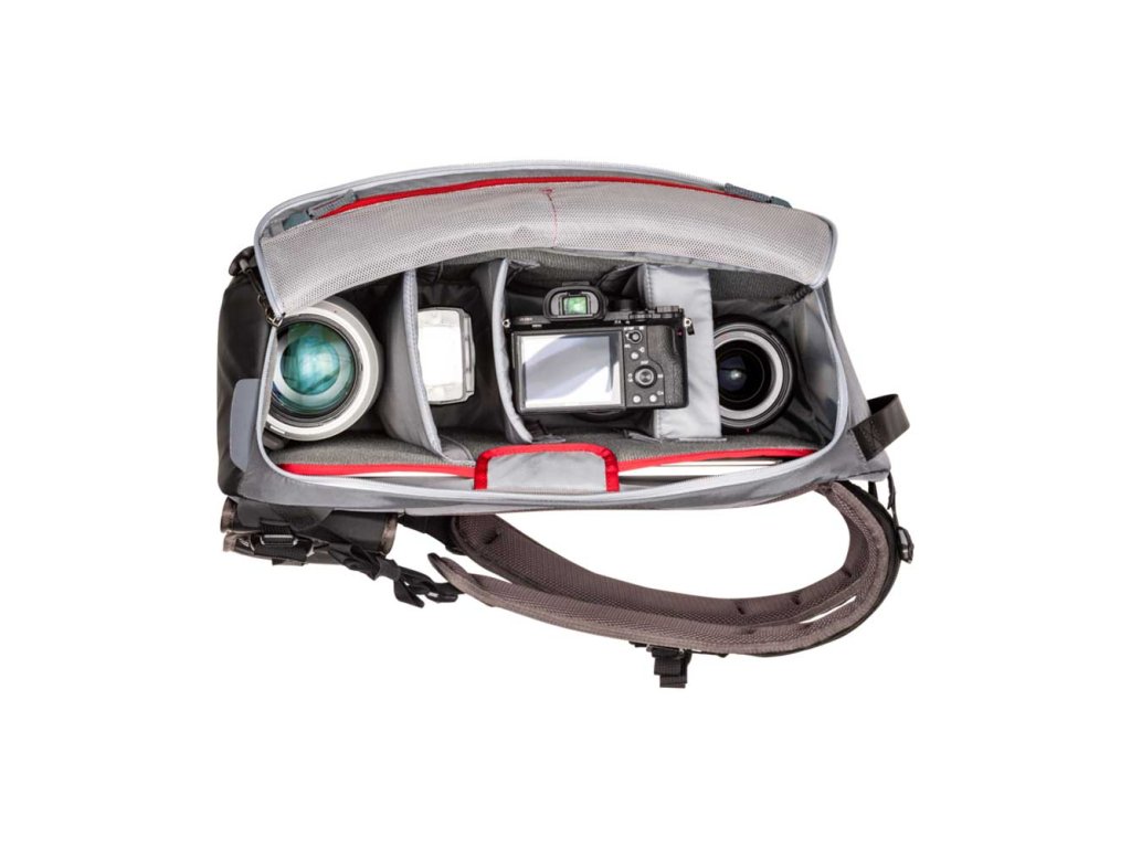 V prostoru pro fotoaparát, na straně batohu přiléhající k nositeli, se nachází zasouvací kapsa pro 15" notebook. Pět nastavitelných a vyjímatelných přepážek umožňuje konfigurovat prostor pro vybavení podle konkrétního fotoaparátu uvnitř.