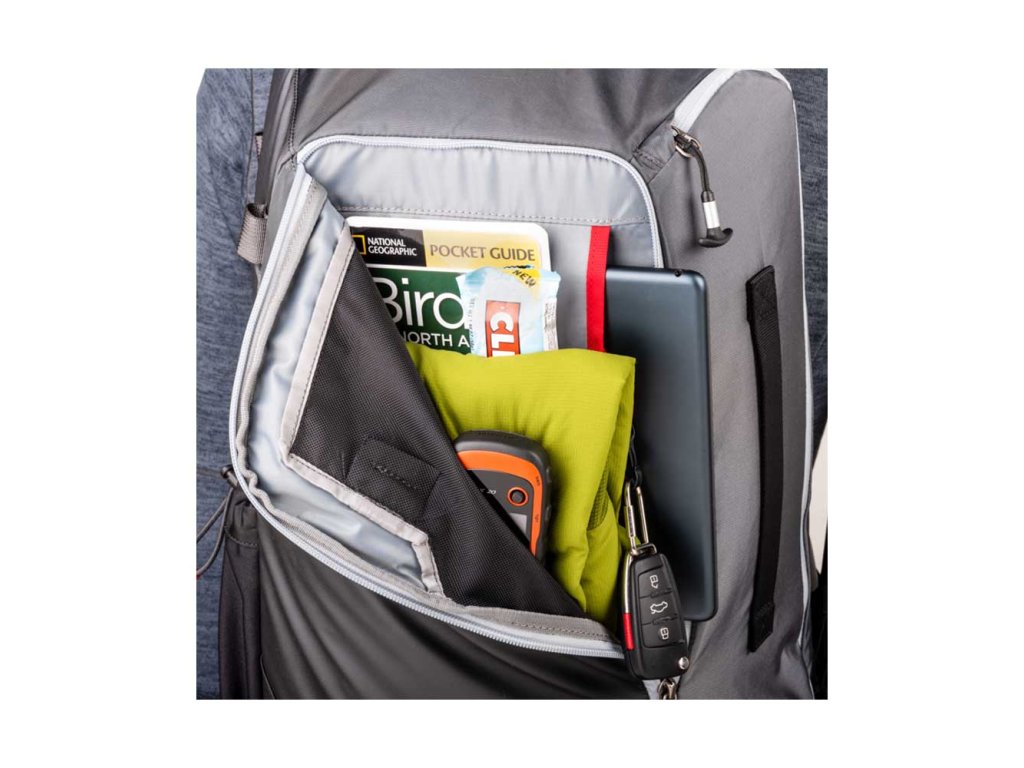 Při otočení batohu PhotoCross 15 ze zadní strany na přední je přístupný také přední panel batohu, který lze rozepnout a odhalit praktický prostor pro knihy, poznámkové bloky, svačinu nebo náhradní oblečení. K dispozici je také kapsa na 10" tablet. Stejně jako zip prostoru pro fotoaparát, je i zip předního panelu opatřen velkým táhlem ve tvaru T, které lze snadno uchopit i za vlhkého nebo chladného počasí.