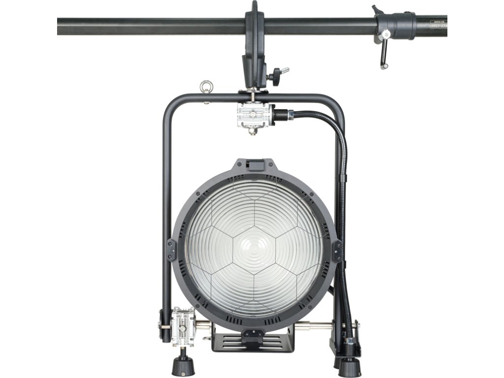 Navrženo na míru pro světlo Evoke 1200/1200B, včetně 3 ovládacích knoflíků pro zaostřování a nastavení otáčení/náklonu.Otáčení a náklon se nastavuje tak, že se zespodu dlouhou tyčí zasunou barevně označené košíčky třmenu. Dodaná skleněná Fresnelova čočka se 4dílnými klapkami se montuje na třmen. Umožňuje zavěšení světla 1200B nad hlavou Obsahuje Fresnelovu čočku s klapkami Otáčení a náklon zespodu dlouhou tyčíDoplňkové parametry