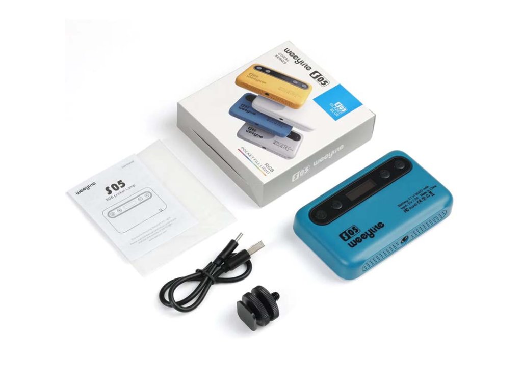 S vestavěnou dobíjecí lithiovou baterií 3,7V/2000mAh může Weeylite S05 pracovat 70 minut na plný výkon. Nabíjení přes konektor USB-C podporuje také nabíjení pomocí powerbanky a nabití trvá 3,5 hodiny. Díky standardnímu 1/4“ závitu ve spodní části a adaptéru na sáňky lze světlo upevnit na fotoaparáty a je kompatibilní s většinou stativů, gimbalů a ramen.