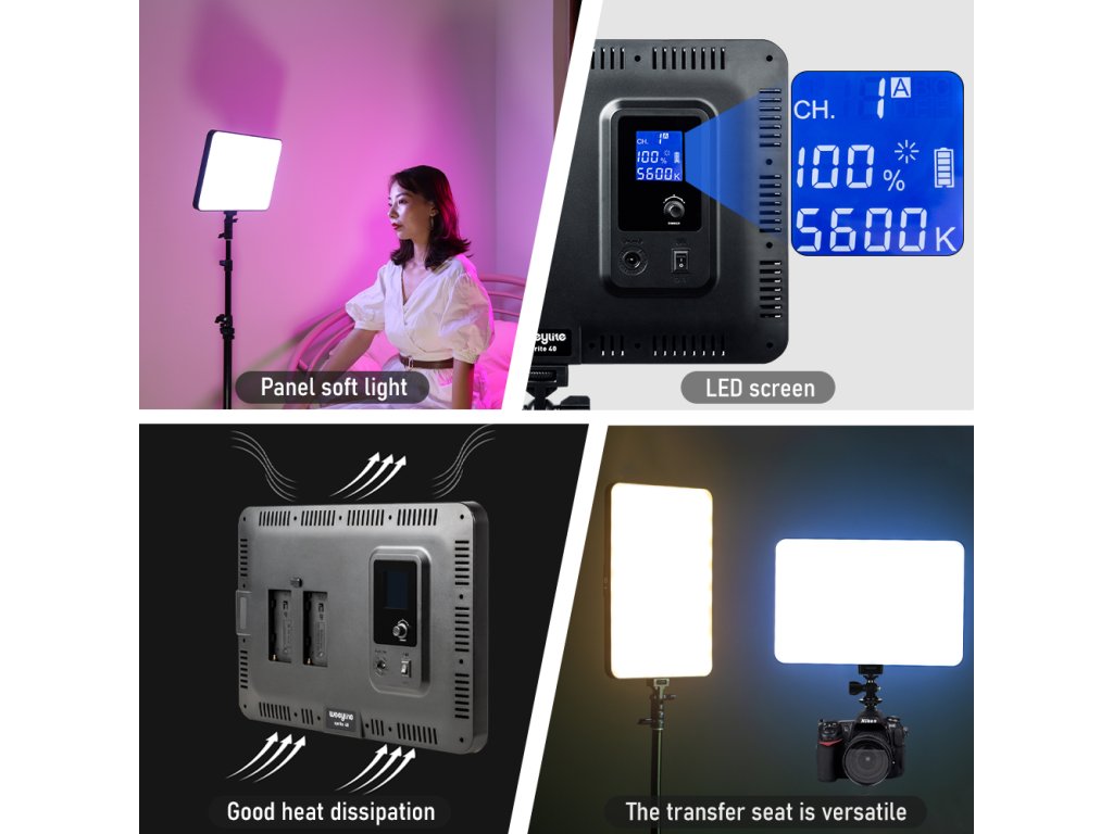 Pomocí aplikace pro dálkové ovládání lze spravovat jedno světlo, a nebo celou skupinu světel; integrovaný LCD displej zobrazuje informace o nastavené barevné teplotě, jasu, stavu baterií apod. Lze napájet prostřednictvím napájecího adaptéru nebo pomocí akumulátorů (nejsou součástí balení).