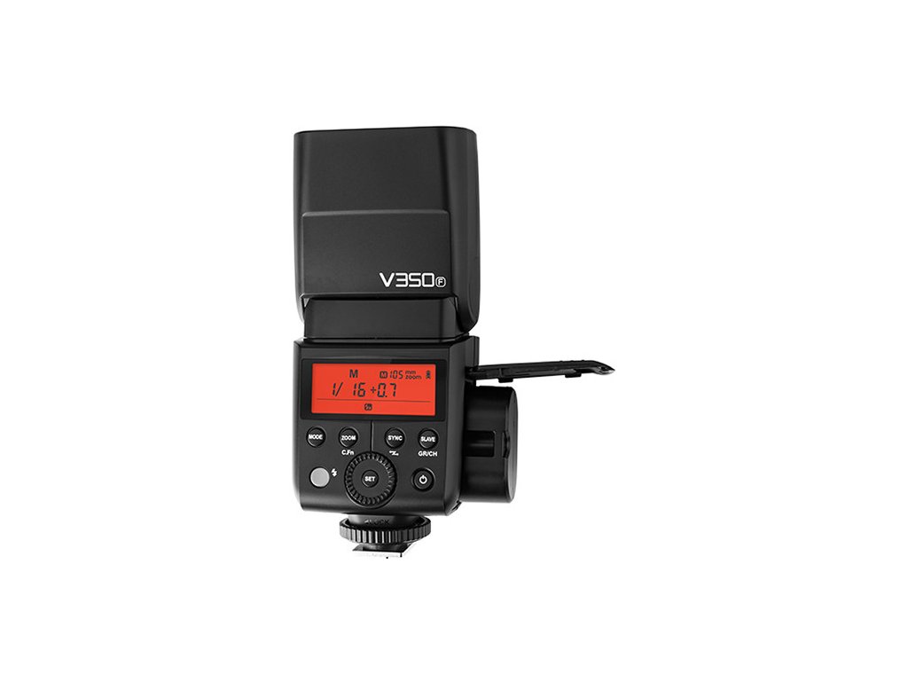 Blesk Godox V350F je navržen pro uživatele digitálních fotoaparátů Fujifilm a kombinuje kompaktní rozměry s profesionálními funkcemi. Díky vestavěné Li-Ion baterii vydrží přibližně 500 plných záblesků a po každém záblesku se zotaví za 0,1 až 1,7 s — to umožňuje rychlé sekvenční fotografování. Hlava blesku má zoom 24–105 mm a lze ji naklonit od -7° do +90° a otočit o 270° horizontálně, což ulehčuje odraz světla od stěn či stropu pro měkčí nasvícení.