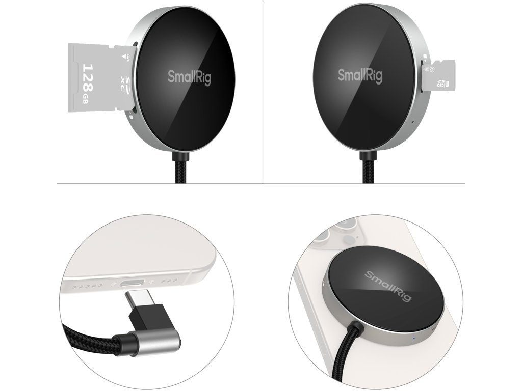 SmallRig 4869 Čtečka karet SD3.0Podporuje různé paměťové karty, včetně SD, SDHC, SDXC, TF, Micro SD, Micro SDXC a Micro SDHC, a umožňuje současné čtení a zápis na karty SD a TF. Tato funkce usnadňuje bezproblémovou synchronizaci, přenos a kopírování dat a zefektivňuje správu souborů.Díky vysokorychlostnímu přenosu přes rozhraní USB 3.0 s rychlostí 104 MB/s lze 1 GB dat přenést za pouhých 10 sekund, takže hromadné kopírování a přenosy velkých souborů jsou hračkou.Čtečka se snadno připojuje k iPhonu pomocí magnetických příchytek, což umožňuje ovládání jednou rukou kdykoli a kdekoli.Její 90° úhlový konektor zajišťuje bezpečné uchycení a zjednodušuje správu kabelů, zatímco kompaktní design umožňuje snadné skladování a přenášení.Kompatibilita:Systémy: Windows / Mac / Linux / Android / HarmonyOS.Mobilní telefony: iPhone řady 15 a 16, Samsung S24 / S23 / S21, Huawei Mate 60 / 50 / Mate 40 / P50 / P40 / P30 Pro / P30 Lite, vivo X100 Ultra / X200 ProPočítače: MacBook Pro / MacBook Air / Surface Book 2 / Surface Laptop / XPS 13 / XPS 15 / Spectre 13t / Spectre x360 / ThinkPad X1 Carbon / Huawei MateBookTablety: iPad Pro 11" (1., 2., 3., 4. generace), iPad Pro 12,9" (3., 4., 5., 6. generace), iPad Air (4., 5. generace), iPad mini 6, iPad mini 7, Huawei MatePadBalení obsahuje:Čtečka paměťových karet SD3.0Doplňkové parametry