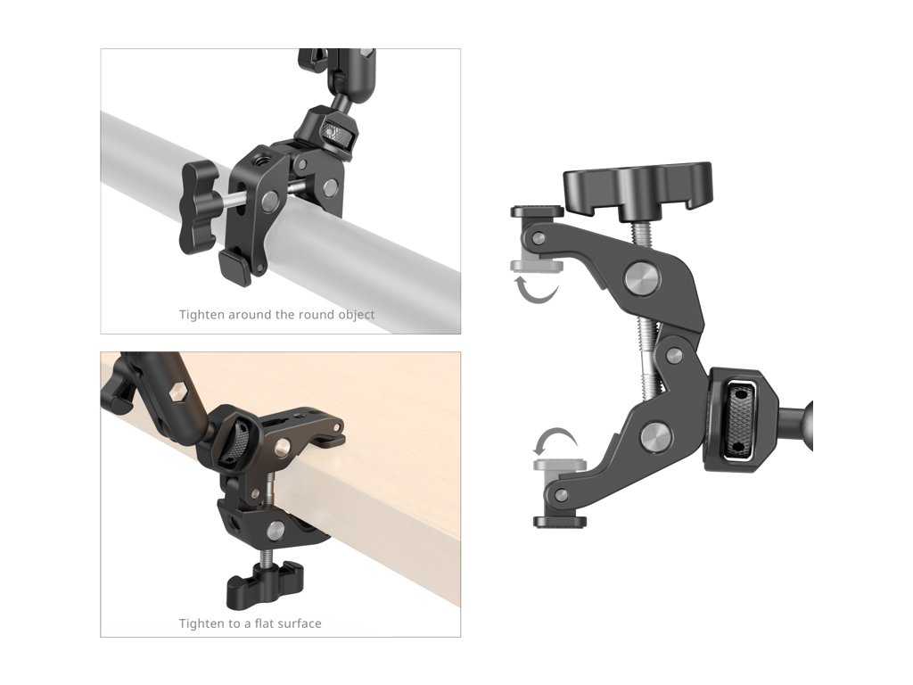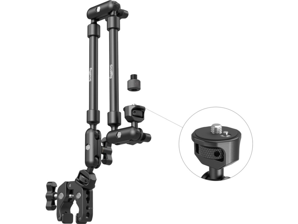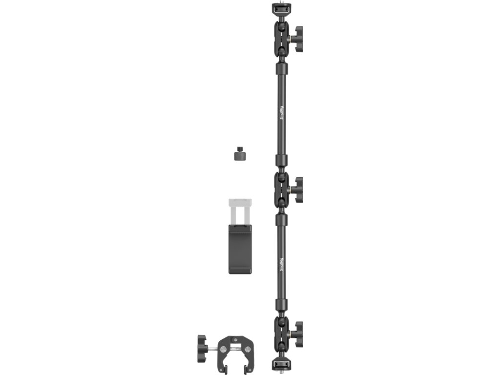 SmallRig 4766 Magic Arm se sadou krabích svorekNastavitelné rameno Magic Arm se připevňuje ke krabí svorce pomocí šroubu se závitem 1/4"-20, který zajišťuje bezpečné spojení mezi svorkou a ramenem.Krabí svorka se vysouvá až na 50,0 cm a přizpůsobuje se různým povrchům a předmětům v jejím dosahu, zatímco silikonové podložky na otočných koncích zajišťují bezpečné uchopení bez poškození povrchů.Kulová hlava na magickém rameni je vybavena protiskluzovými gumovými podložkami, které zvyšují tření a zajišťují pevnější zajištění zařízení.Svorka telefonu je navržena tak, aby se do ní vešly telefony o šířce od 7,0 do 10,0 cm.Adaptér se závitem 1/4"-20 na 3/8"-16 je kompatibilní s mikrofony pro živé vysílání, podcasting a různé scénáře nahrávání zvuku.Hlavní tělo je vyrobeno z odolné hliníkové slitiny a účinně unese až 0,25 kg.Pro fotografování s lehkými zařízeními doporučujeme použít také svorku SmallRig ve tvaru kraba s ramenem Ballhead Magic Arm 3757 a přenosný držák SmallRig Dual Suction Cup SC-2K 3566.Balení obsahuje:1x rameno Magic Arm1x Krabí svorka1x držák na telefon1x adaptér se závitem 1/4"-20 na 3/8"-16Doplňkové parametry