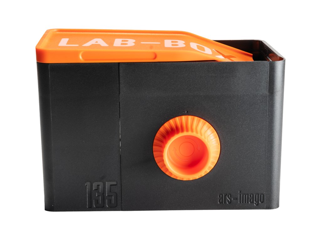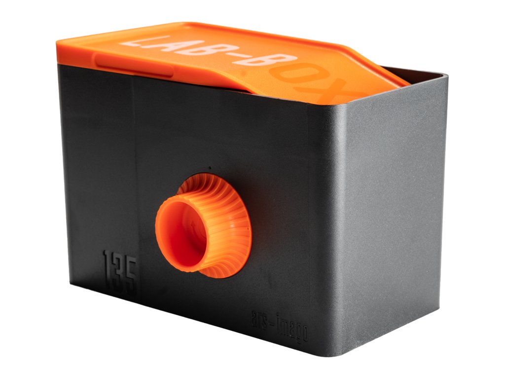 Univerzální a modulární: s jedinou nádrží můžete vyvinout formáty 120 i 135, stačí vyměnit vyhrazený modul.Kompaktní a univerzální: díky svým rozměrům se snadno přenáší v taškách a jakýchkoli batozích.Snadné a rychlé: díky jednoduchému a intuitivnímu postupu můžete filmy vkládat a vyvolávat, aniž byste museli být ve tměVšestranný e Profesionální: ideální pro ty, kteří začínají vyvolávat sami, ale také užitečný pro potřeby poloprofesionálů a profesionálů díky různým procesům, které umožňujeDodávaný modul 135 má navržený prostor, do kterého je třeba vložit a uzamknout 35mm svitek.Film se poté připne a po zavření víka se otáčením vnějšího knoflíku automaticky vloží do vnitřního kotouče. Jakmile je načítání dokončeno, nůž odřízne poslední část filmu a můžete začít vyvolávat.MÍCHÁNÍ BĚHEM VYVOLÁVÁNÍMůžete si zvolit, zda chcete používat nepřetržité (doporučené), nebo přerušované míchání.Nádržku můžete naplnit až do poloviny její kapacity (290 ml), pokud se rozhodnete pro průběžné míchání, nebo můžete nádržku zcela naplnit (490 ml), pokud se rozhodnete pro přerušované míchání. Můžete také experimentovat s jinými způsoby míchání.Po nalití kapalin do nádrže můžete pokračovat v míchání otáčením vnějšího knoflíku nebo kliky, která bude otáčet vnitřním bubnem. Správné míchání je klíčové pro dosažení homogenních výsledků.DESIGNLAB-BOX je projekt společnosti ars-imago. Design a prototipy byly kurátorsky připraveny v Římě v Itálii.Po pečlivém testování a revizi jsme mohli optimalizovat konečné rozměry LAB-BOXu a co nejvíce zjednodušit konstrukci nádrže, aby mohl vzniknout odolný a zároveň snadno použitelný výrobek. Náš specializovaný tým pracoval na technických projektech několik měsíců a díky moderním technologiím vytvořil mnoho 3D modelů a prototypů.Tyto fólie nelze vkládat do modulu LAB-BOX 120 a v modulu LAB-BOX 135 je lze obtížně připnout:JCH 400Kodak Gold 200 120Rollei InfraredRollei 80sRollei Superpan 200Rollei 400sFomapan 100Fomapan 200Fomapan 400Bergger 400 120CatLABS X FILM ISO 80 120Arista filmFilm AstrumLomography Earl Grey B&W 100Silberra