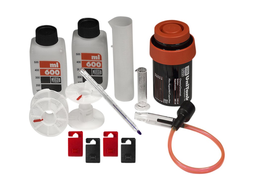 Do nádrže 1520 lze umístit dva bubny 1501. To znamená, že lze současně vyvolávat dva 35mm filmy. Při úpravě na šířku 6 cm pojme cívka 1501 dva filmy 120. Červená svorka zabraňuje překrývání filmů. Kaskádová myčka filmů umožňuje úsporné a účinné zavodnění.1 zásobník JOBO 1520 (včetně 2 cívek 1501)2 láhve JOBO s měřítkem (600 ml)1 stupnice JOBO (260 ml)1 JOBO Graduate (20ml)2 sady filmových klipů JOBO1 barevný teploměr JOBO1 kaskáda JOBODoplňkové parametry