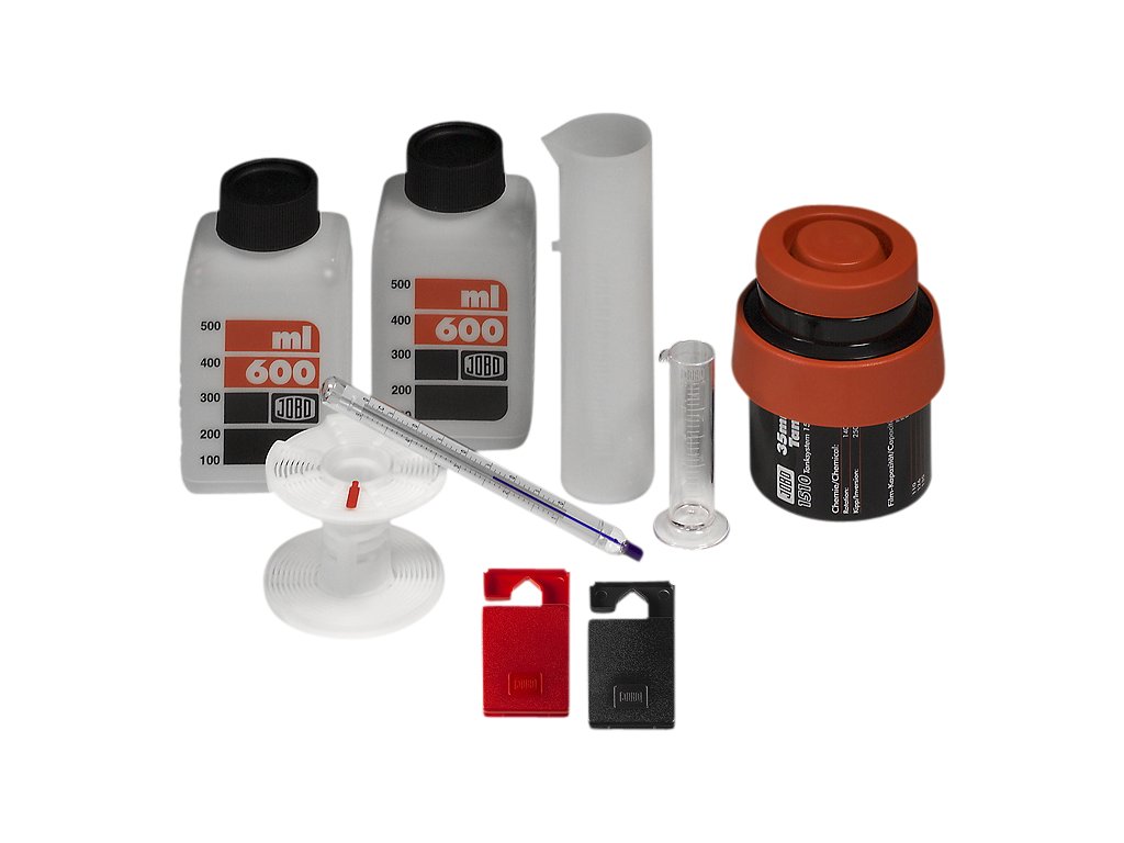 Do zásobníku 1510 se vejde jeden 35mm film na jedné cívce 1501. Odměrky JOBO (260 ml a 20 ml) umožňují přesné měření jakékoli kapaliny. Dvě lahve se stupnicí (600 ml) umožňují ideální skladování vývojky a fixační chemie. Přesný teploměr zajišťuje, že chemie má ideální teplotu pro vaše potřeby (obvykle 20°). Praktické svorky na filmy zajišťují, že váš drahocenný film visí při sušení dokonale rovně.1 nádrž JOBO 1510 (včetně 1 cívky 1501)2 láhve JOBO se stupnicí (600 ml)1 stupnice JOBO (260 ml)1 JOBO Graduate (20 ml)1 sada filmových klipů JOBO1 barevný teploměr JOBODoplňkové parametry