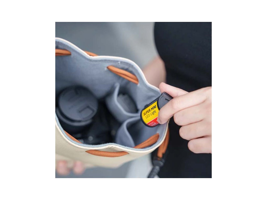 Uvnitř najdete dvě skoro neviditelné kapsy, ideální pro baterii, filmy nebo drobné příslušenství, které oceníte na cestách. Vak je odolný vůči stříkající vodě a bezpečně uzavíratelný pomocí pevného pleteného šňůrového uzávěru se sponou. Kovové části z nerezové oceli zaručují dlouhou životnost bez koroze, a stabilní dno chrání váš fotoaparát, i když vak postavíte.