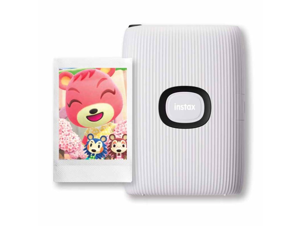 Malá, lehká tiskárna Instax Mini Link 2 s nápadnou pruhovanou strukturou a ve třech barvách. Na jedno nabití dokáže vytisknout přibližně 100 snímků. LED pásek okolo tlačítka instax informuje o režimu a stavu aplikace a funkční tlačítko na horní straně slouží ke kreslení v rozšířené realitě.