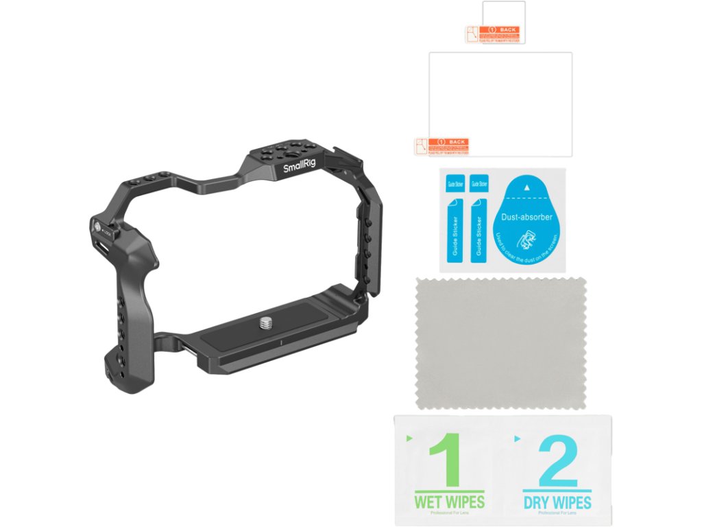 Klec SmallRig 4978 pro Canon EOS R5 Mark IIKlec je vybavena bezpečným zajišťovacím mechanismem se spodním šroubem 1/4"-20 a dvěma bočními polohovacími bloky spolu s integrovanými silikonovými podložkami, které zabraňují poškrábání fotoaparátu.Klec je precizně navržena a nebrání v přístupu k tlačítkům, rozhraním, voličům, výklopnému displeji, prostoru pro baterii ani slotu na kartu.Klec je vybavena několika otvory se závitem 1/4"-20 a polohovacími otvory 1/4"-20 pro kompatibilitu s pomocným příslušenstvím, jako jsou boční rukojeti SmallRig, magická ramena, držáky monitorů, základní desky Manfrotto a sady montážních desek ve tvaru L.Je také vybaven držákem na studenou patku pro připojení mikrofonů a osvětlovacího příslušenství.Klec je vybavena běžnými otvory pro popruhy kompatibilními se zápěstními popruhy SmallRig, inovativním otvorem pro zavěšení popruhu směrem dolů pro větší ochranu objektivu a rozhraním QD kompatibilním s rychloupínacími ramenními popruhy QD.Rychloupínací základová deska Arca-Swiss umožňuje přímou montáž na stativy/hlavy typu Arca a stabilizátory DJI RS 2 / RSC 2 / RS 3 / RS 3 Pro / RS 4 / RS 4 Pro, což umožňuje rychlý přechod mezi nastavením se stabilizátorem, ručním držením a stativem.Klec navíc obsahuje ve spodní části magnetický klíč na dvě hlavy pro snadnou montáž a demontáž.Klec je dodávána s odolným ochranným krytem obrazovky z tvrzeného skla odolného proti poškrábání s tvrdostí povrchu 9H a stupněm odolnosti proti nárazu IK03.Kompatibilita:Canon EOS R5 Mark IIBalení obsahuje:1x klec1x ochranné sklo z tvrzeného skla1x uživatelská příručkaDoplňkové parametry