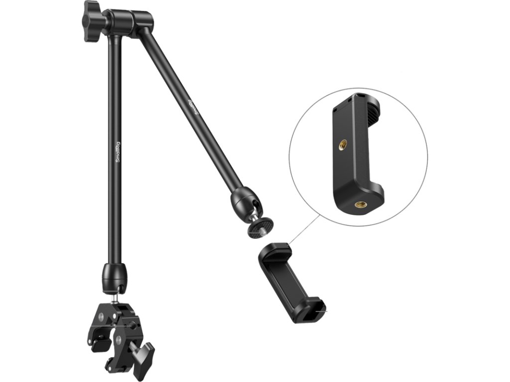 SmallRig 5624 Desktop Magic Arm with Crab-Shaped Clamp KitSvorka se může pochlubit 50mm otvorem čelistí s ochrannými silikonovými podložkami, které zajišťují bezpečné uchopení rovných povrchů i válcových předmětů bez poškození upínaného povrchu. Přiložená svorka na telefon je kompatibilní se zařízeními o šířce 65-80 mm.Nástroj je vyroben z robustní hliníkové slitiny a unese užitečné zatížení až 0,25 kg, což zaručuje výjimečnou odolnost. Pro podobné sestavy s kompaktním vybavením zvažte kouzelné rameno SmallRig se sadami s upínáním ve tvaru kraba (4766) nebo sadami se dvěma přísavkami pro upevnění fotoaparátu (3566).Ckompatibilita:Trubky / tyče: 18-50 mm v průměruPlochý povrch: ≤45 mm tloušťkyBalení obsahuje:Integrované magické rameno se svorkou ve tvaru krabaSvorka na telefon.Doplňkové parametry