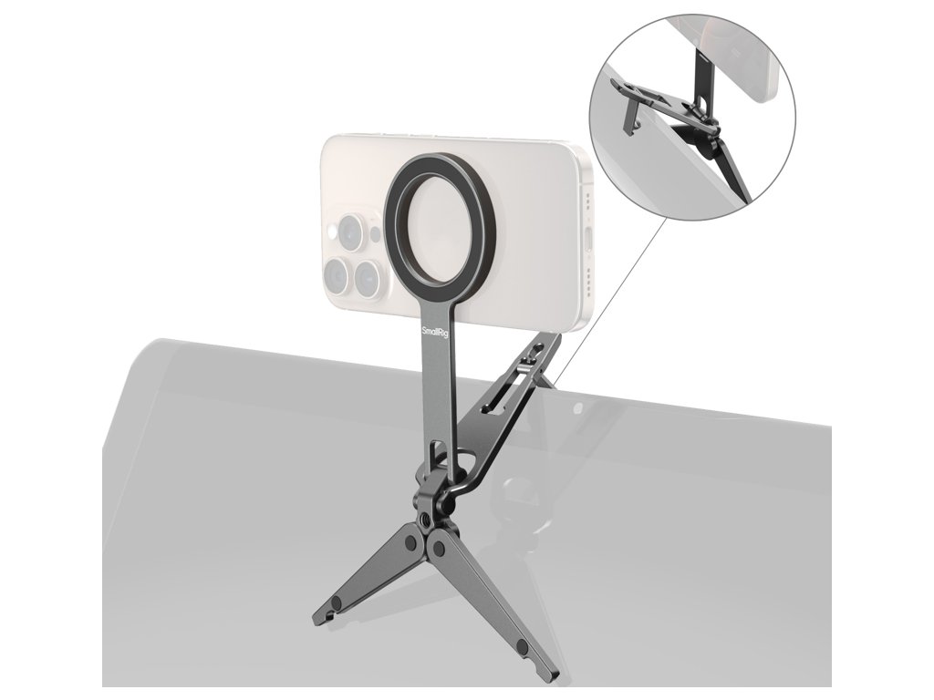 SmallRig 5649 s podporou mobilních telefonůKompatibilní s modely iPhone 12-17 podporujícími MagSafe, obsahuje také adaptér s magnetickým kroužkem pro zařízení bez MagSafe. Stativová základna je vybavena protiskluzovými silikonovými podložkami pro stabilní umístění a integrovaný hákový držák umožňuje bezpečné upevnění na povrchy, jako jsou obrazovky počítačů (až do tloušťky 4 mm) nebo ploty z drátěného pletiva na straně hřiště pro stabilní záznam. Skládací konstrukce zajišťuje kompaktní tvar při skladování, takže je lehká a vysoce přenosná.Poznámka:Max nosnost: 300gMax podpěrná výška (vertikální): Maximální tloušťka háku: 16 cmMax: Vyvarujte se připevnění na kreditní karty, pasy, naslouchátka atd., protože by mohlo dojít k jejich demagnetizaci. Mějte je prosím odděleně.Balení obsahuje:Telefonní podporaKovový kroužek.Doplňkové parametry