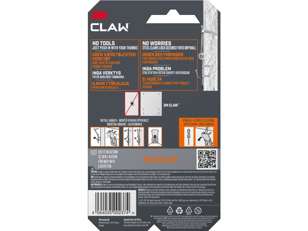 3M Claw Hook for drywall, hold 30 kg, 2 hooks