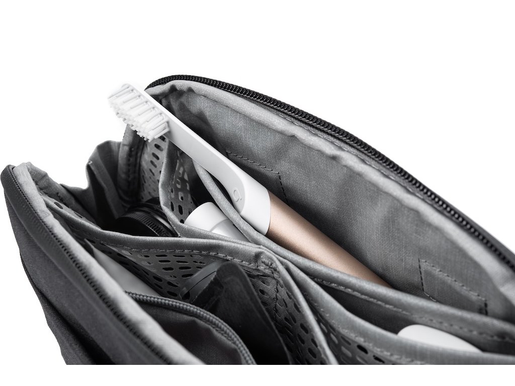 - Vyhrazená magneticky uzavíraná kapsa na zubní kartáčky s vytažitelnou podšívkou pro snadné čištění a opláchnutí