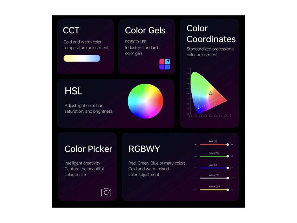 Vysoká kvalita světla je zaručena díky indexu podání barev (CRI) ≥95 a TLCI ≥97, což znamená, že barvy na vašich fotografiích a videích budou vypadat věrně a přirozeně. Pokročilá technologie rozptylu světla zajišťuje měkké a rovnoměrné osvětlení, což často eliminuje potřebu dalších softboxů nebo difuzérů.