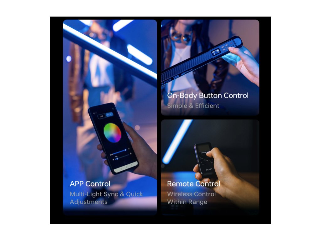 Ovládání Viltrox K90 je navrženo tak, aby bylo intuitivní a efektivní, ať už jste začátečník nebo zkušený profesionál. Nabízí několik možností ovládání, které se přizpůsobí vašim potřebám a pracovnímu postupu. Nastavení lze snadno upravit pomocí tlačítek přímo na těle světelné tyče, přičemž OLED displej zobrazuje aktuální nastavení, což usnadňuje přesné úpravy i v náročných podmínkách. Pro maximální flexibilitu a kontrolu je k dispozici mobilní aplikace Viltrox Link, která se propojuje se světlem přes Bluetooth. Tato aplikace vám umožní precizně nastavit barvu, jas (v rozmezí 0 až 100 %) a aktivovat různé speciální efekty s nebývalou lehkostí.