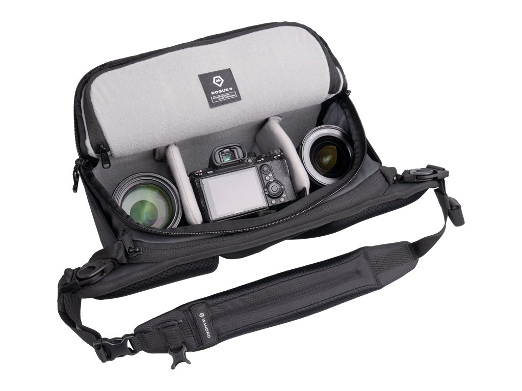 ROGUE Sling 9LKonstrukce a materiály:S použitím stejných materiálů odolných proti povětrnostním vlivům jako zbytek řady ROGUE přidává popruh 9L konstrukci, která podporuje rozsáhlejší sadu fotoaparátů a notebook nebo tablet. Polstrovaný, tvarovaný popruh a prodyšný zadní panel pomáhají udržet náklad stabilní a pohodlný po celý dlouhý den.Klíčové vlastnosti:Polstrovaný prostor pro fotoaparát s konfigurovatelnými přepážkami pro tělo, více objektivů a příslušenství.Vyhrazené pouzdro pro větší tablet nebo tenký notebook.Vnitřní síťované kapsy a organizéry na zip pro drobné příslušenství.Vnější kapsa a přípojné body pro láhev s vodou nebo kompaktní stativ.Integrovaný stabilizační popruh pro zajištění poutka při aktivním používání.Ideální pro fotografy, kteří chtějí mít plný přístup k výbavě ve formátu crossbody. Dobře se hodí pro fotografování událostí a situace vyžadující rychlou změnu polohy a bezpečné přenášení vybavení.Další informace:Pásek ROGUE Sling 9L se integruje s příslušenstvím WANDRD a je k dispozici v několika barvách.Co je součástí baleníROGUE 9L SlingVložka do kostky fotoaparátuNastavitelné přepážky (3)Stabilizační popruhSvorka na klíčeZáruční listDoplňkové parametry