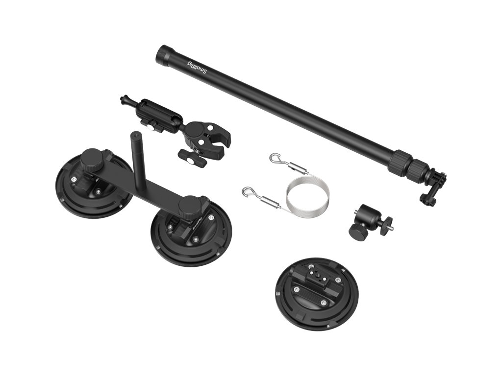 SmallRig 5843 Sada přísavek pro akční kamery do vozidelJe ideální pro natáčení v autě i na vozidle. Je kompatibilní s oblíbenými akčními kamerami, jako jsou Insta360 X5 / 4, GoPro 12 / 11 a DJI Osmo Action 4 / 3, a pomáhá dosáhnout leteckých pohledů z dronu.Tato montážní sada, vyrobená převážně z hliníkové slitiny, zajišťuje odolnost a stabilitu s dynamickou nosností 0,5 kg, takže je vhodná pro většinu akčních kamer na trhu. Přísavky jsou vybaveny mechanismem push-pump a bílou bezpečnostní indikační linkou pro jasné sledování stavu přísavky, což zajišťuje bezpečnou a stabilní podporu. Teleskopická tyč se nastavuje od 45 do 120 cm a každá sekce je opatřena otočným zámkem, který zabraňuje sklouznutí během dynamického natáčení. Poznámka:Nevhodné pro použití na lakovaných površích, přírodním mramoru, starých dlaždicích, prodyšných tapetách, stěnách z křemeliny, nelakovaném dřevě, matném skle nebo jiných drsných, porézních materiálech.Maximální dynamické zatížení pro konfigurace s trojitou, dvojitou a jednoduchou přísavkou je 0,5 kg. Statické zatížení kleště ve tvaru kraba nesmí překročit 2 kg.Doporučujeme používat přiložený bezpečnostní popruh o délce 120 cm (47,2 palce) a každé dvě hodiny jej zkontrolovat.Balení obsahuje:3x 4" přísavkaTeleskopická tyčIntegrované rameno Magic Arm s kleštinovým držákem ve tvaru krabaPodpěra s kulovou hlavouZákladní deskaDržák akční kameryBezpečnostní úchyt2x šroub 1/4"-20Doplňkové parametry