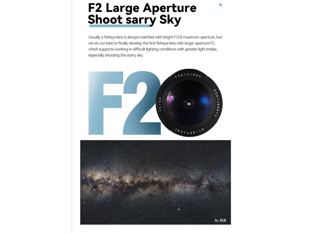 Obvykle je objektiv typu rybí oko vždy spojen se světelnou maximální clonou F/2,8, ale my se snažíme vyvinout první objektiv typu rybí oko s větší clonou F2, který podporuje práci v obtížných světelných podmínkách s větším příjmem světla, zejména při fotografování hvězdné oblohy.