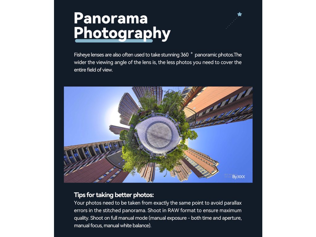 Objektivy typu rybí oko se také často používají k pořizování úžasných panoramatických fotografií v rozsahu 360°. čím širší je zorný úhel objektivu, tím méně fotografií potřebujete k pokrytí celého zorného pole.