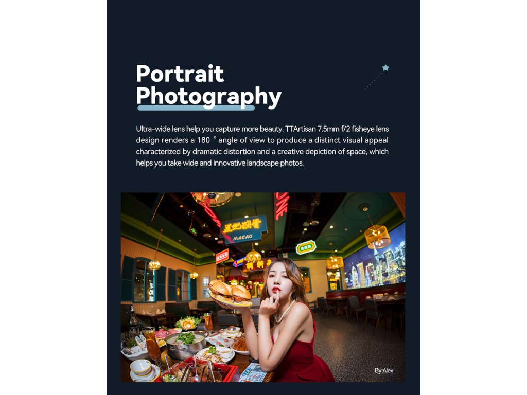Ultraširoký objektiv vám pomůže zachytit více krásy. Konstrukce objektivu TTArtisan 7,5 mm f/2 rybí oko vykresluje 180° úhel záběru a vytváří tak výrazný vizuální dojem charakterizovaný dramatickým zkreslením a kreativním zobrazením prostoru, což vám pomůže pořizovat široké a inovativní fotografie krajiny.