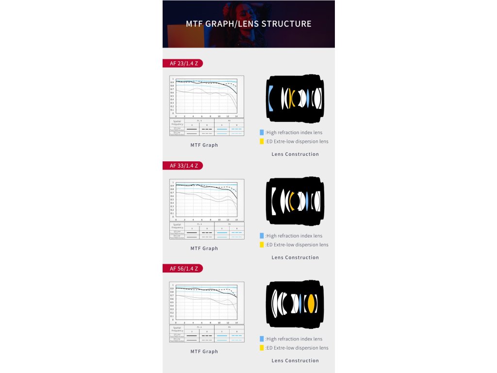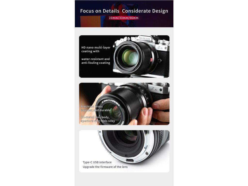 Po bajonetech E/X/M pro Sony Fuji a Canon přichází konečně řada Viltrox 23 mm/33 mm/56 mm s bajonetem Z, který je určen pro modely fotoaparátů Nikon s APS-C snímačem, jako je Z50 a nejnovější Nikon Zfc, ale stále je vhodný pro full-frame řadu. Tato řada objektivů je vybavena funkcí Eye-AF, lineární clonou, motorem STM a také aktualizací firmwaru pro USB-C. Rozhodně jsou překvapivou volbou pro portréty, krajiny, architektonickou nebo pouliční fotografii atd!