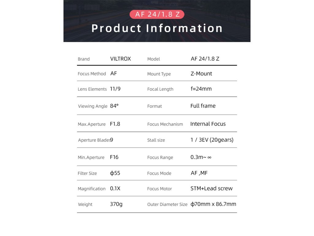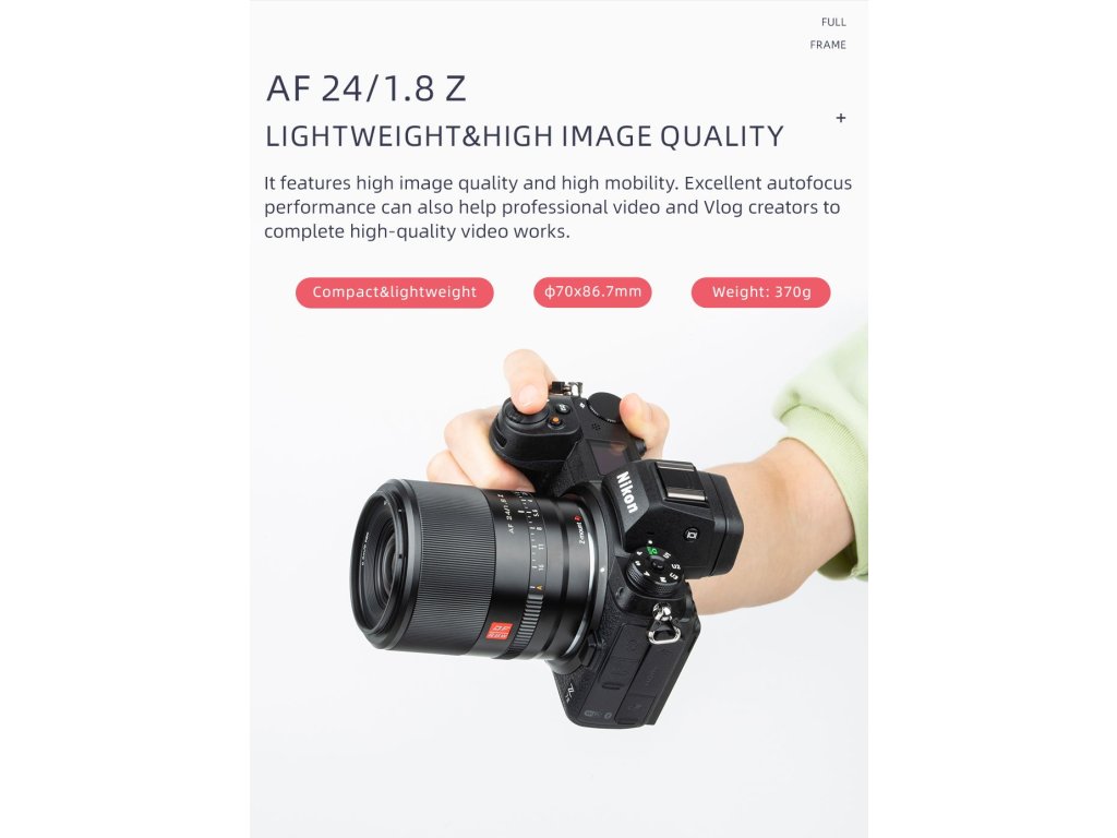 Viltrox AF 24/1,8 Z je širokoúhlý objektiv s automatickým ostřením pro full-frame fotoaparáty s bajonetem Z, určený pro bezzrcadlovky Nikon. Je vybaven lineární clonou, automatickým ostřením s detekcí očí a portem pro upgrade typu C. Vhodný pro fotografování krajiny, městských scenérií, portrétů, astrofotografie a architektury atd.